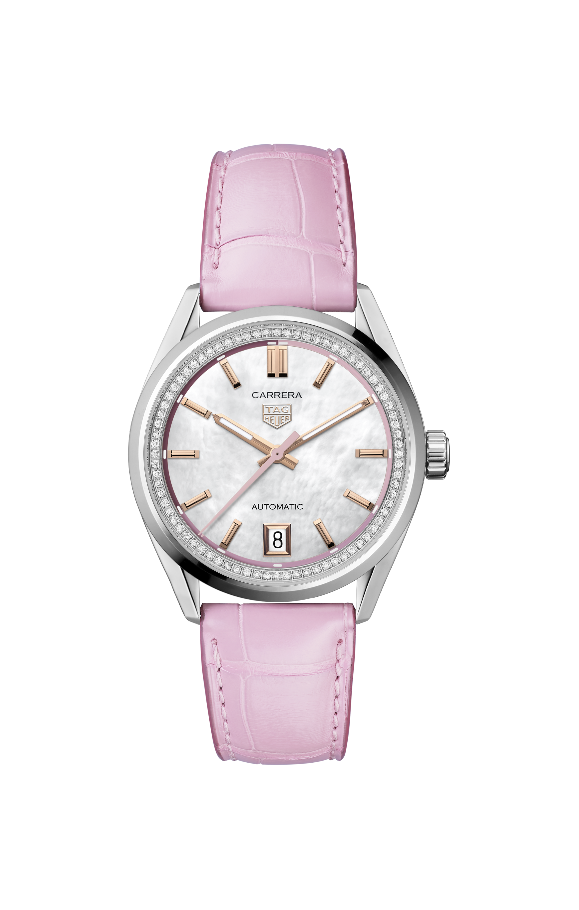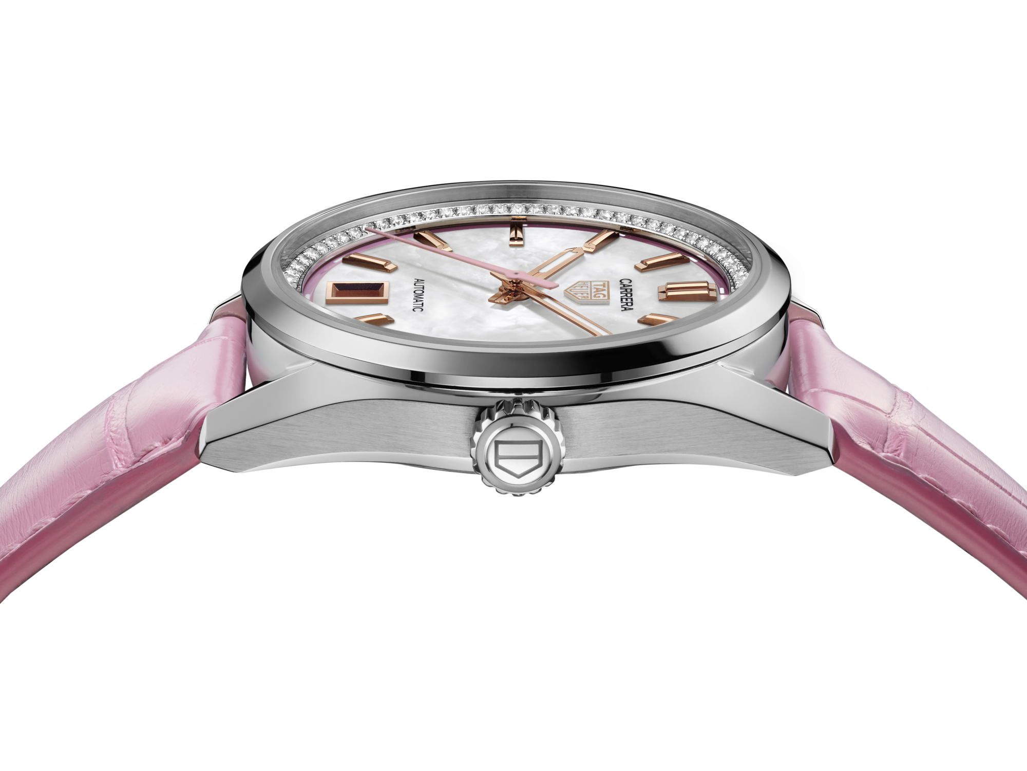 Le cadran en nacre avec un dégradé de rose sur le pourtour de la montre et le rehaut en diamant sont d'une grande élégance. Les index et les aiguilles plaqués or rose 18 carats 5N, ainsi que l'aiguille centrale laquée rose, renforcent ses qualités haut de gamme, tandis que la date angulaire à 6 heures renforce son aspect pratique.