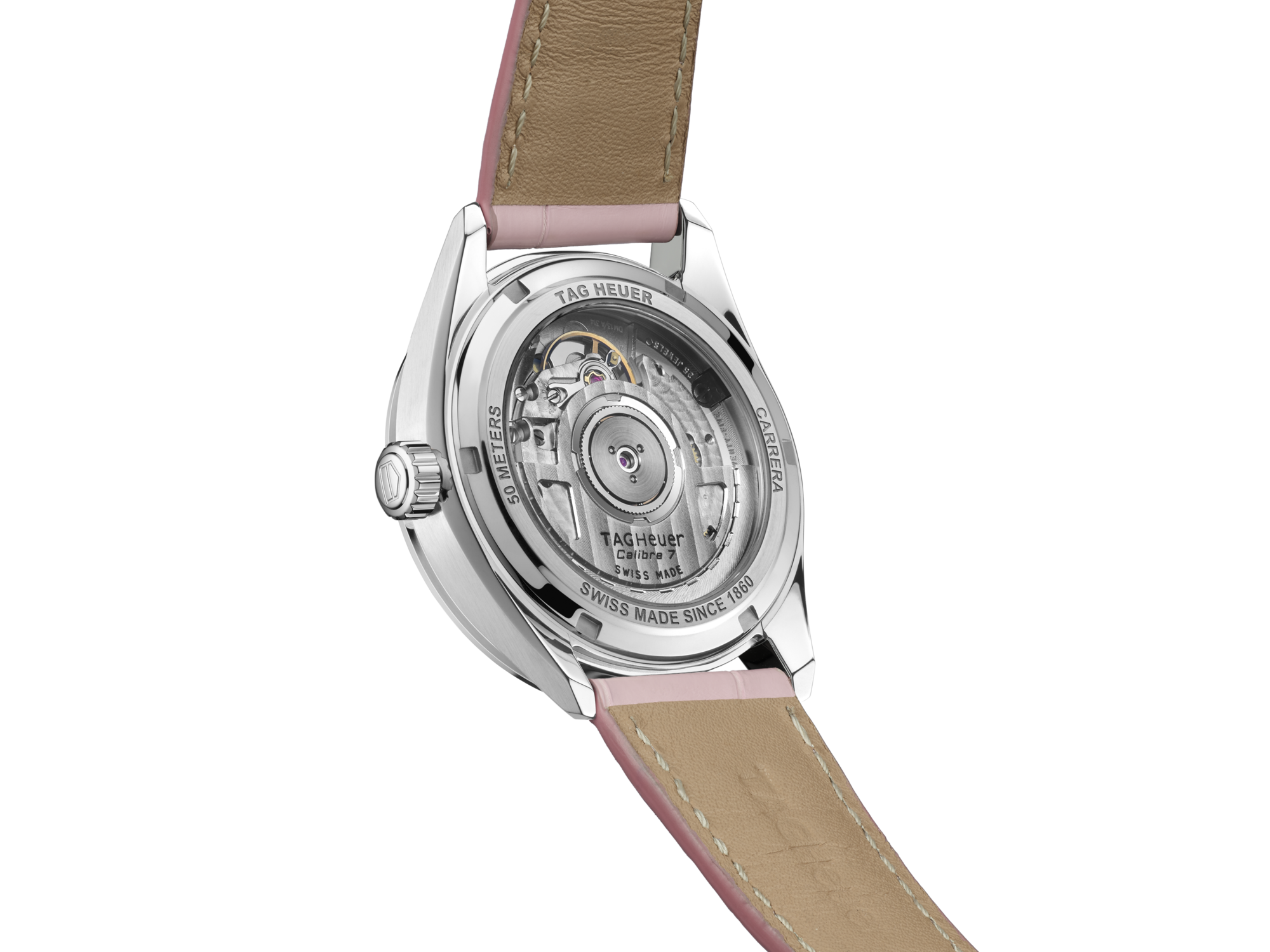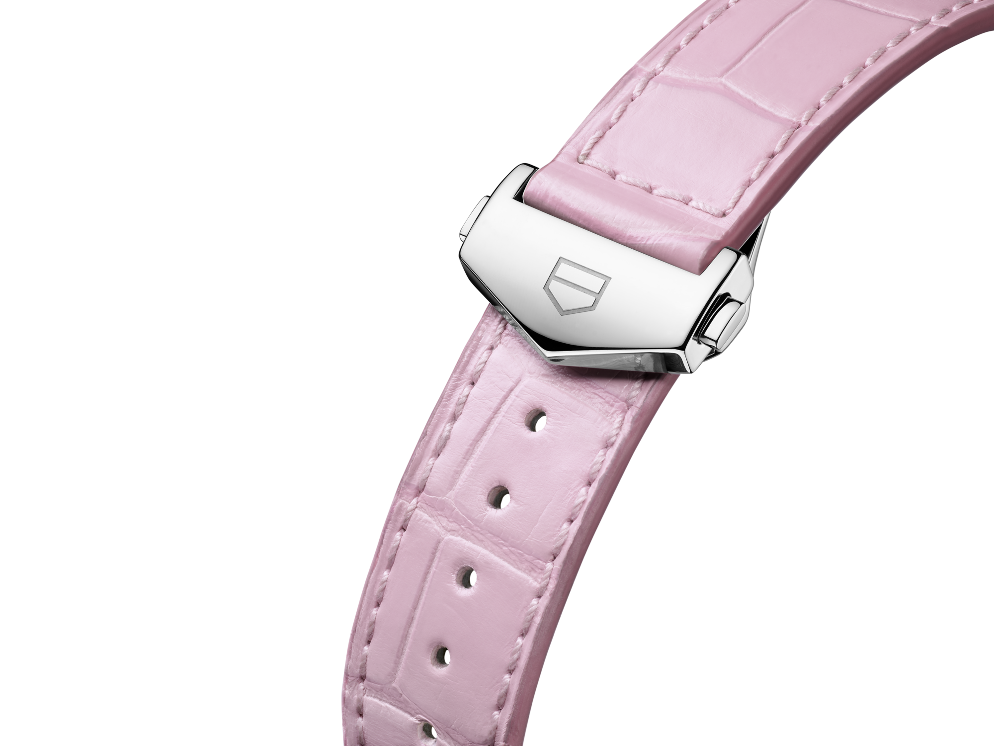 Le bracelet en cuir d'alligator rose est doté d'une boucle déployante avec des boutons-poussoirs à double sécurité et d'un système de réglage par goupille. Le blason de TAG Heuer sur le fermoir ajoute une touche d'élégance et d'histoire à cette montre de luxe.