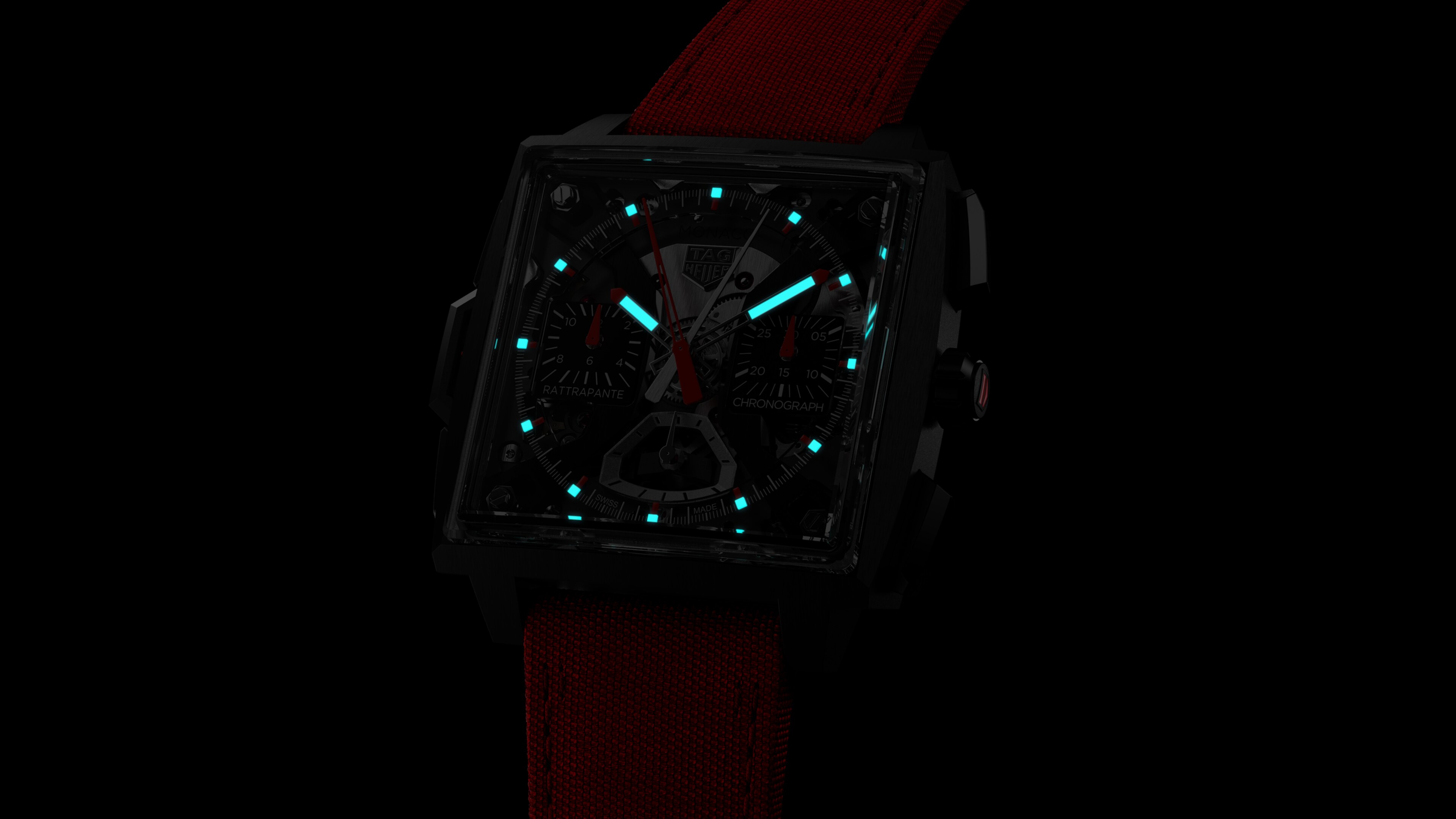 With its stealthy titanium case coated with black DLC and red accents, such as the red lacquered rattrapante hand, the TAG Heuer Monaco Split-Seconds Chronograph is a dynamic homage to TAG Heuer's storied racing DNA, inspired by speed and motorsport.