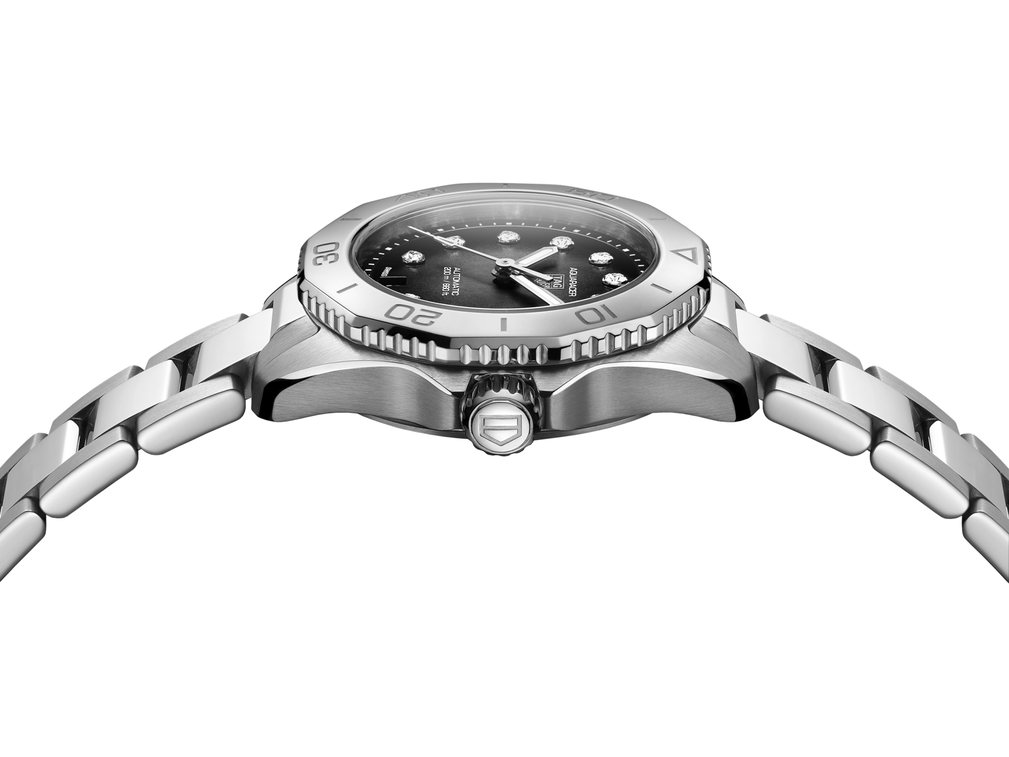 Refined ergonomics and case finishing add to the technicity of this 30mm steel TAG Heuer Aquaracer, made to overcome your personal limits.