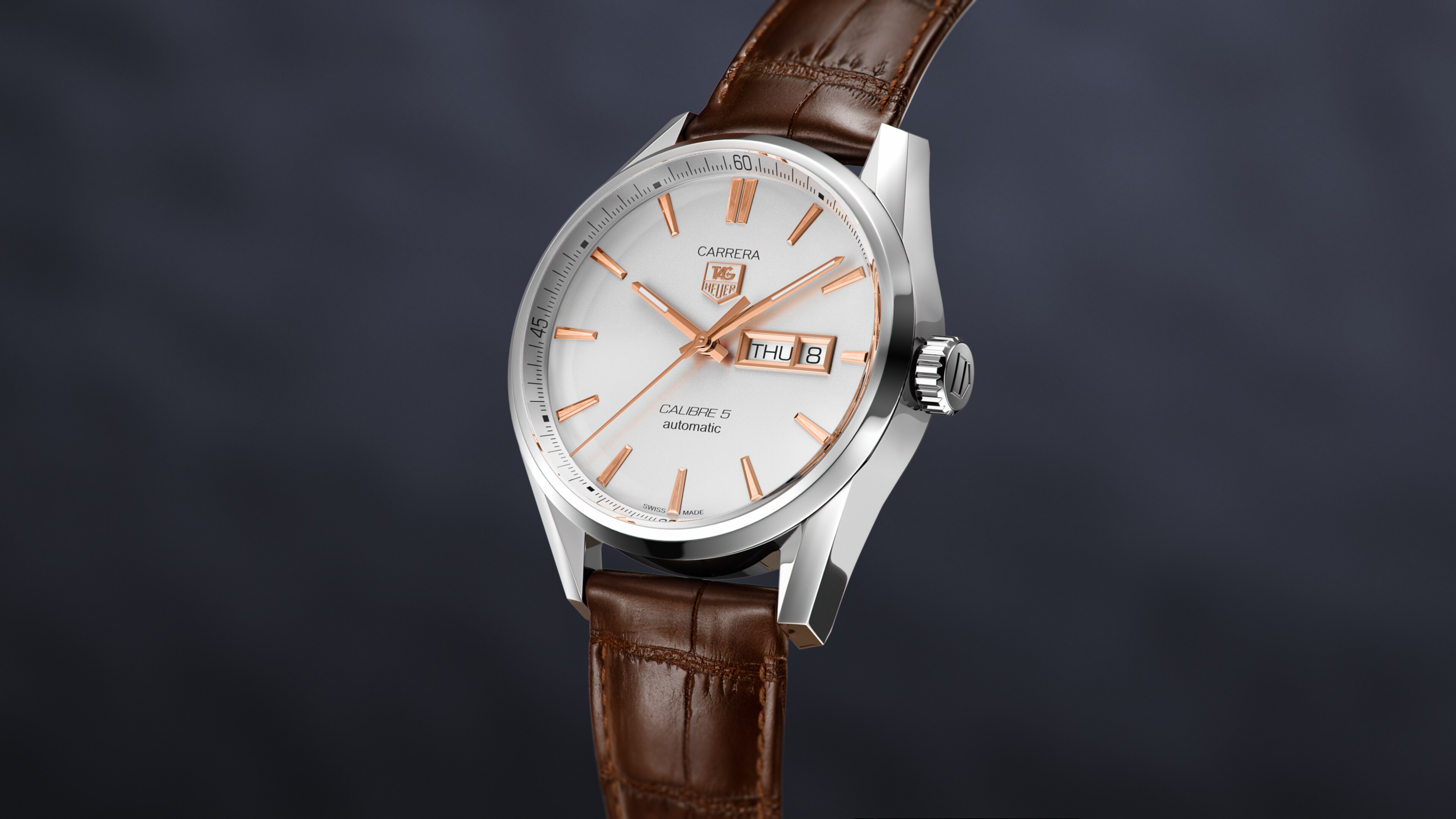 The white dial is the perfect foil for the burnished glow of the rose-gold second hand, indexes, hour and minute hands, TAG Heuer logo and Day-Date window at 3 o’clock.