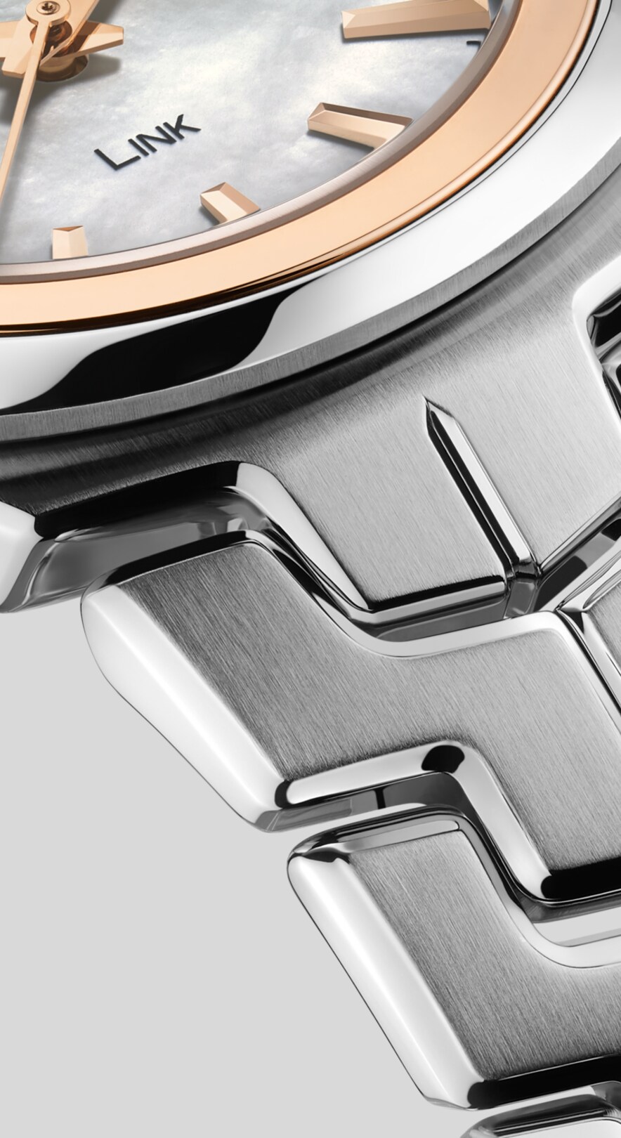 Quartz, 32 mm, Steel & 18K gold WBC1350.BA0600A rose-gold edition of the bestselling Link Lady Quartz with white mother-of-pearl dial. The 32mm case forged in the line’s signature stainless steel. The sides are polished and rounded. It sparkles day and night.