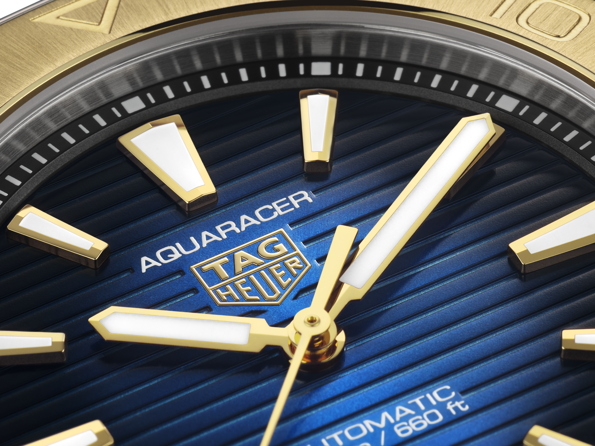 Elegance is in every detail of this prestigious TAG Heuer Aquaracer, blending the strength of 18K 3N solid yellow gold with sporty rubber. Overcome your limits with this uniquely styled watch, designed for those who dare to go further.