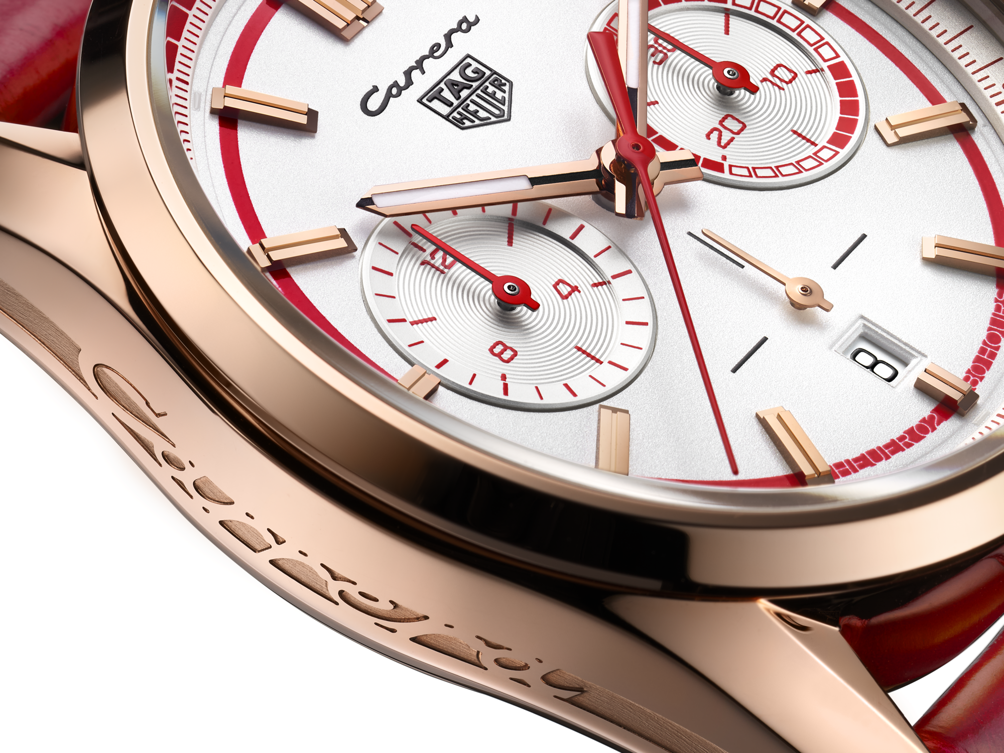 Drive to surpass with a striking livery in red and white, perfectly accented by the bold Carrera branding on the dial, case profile and strap.