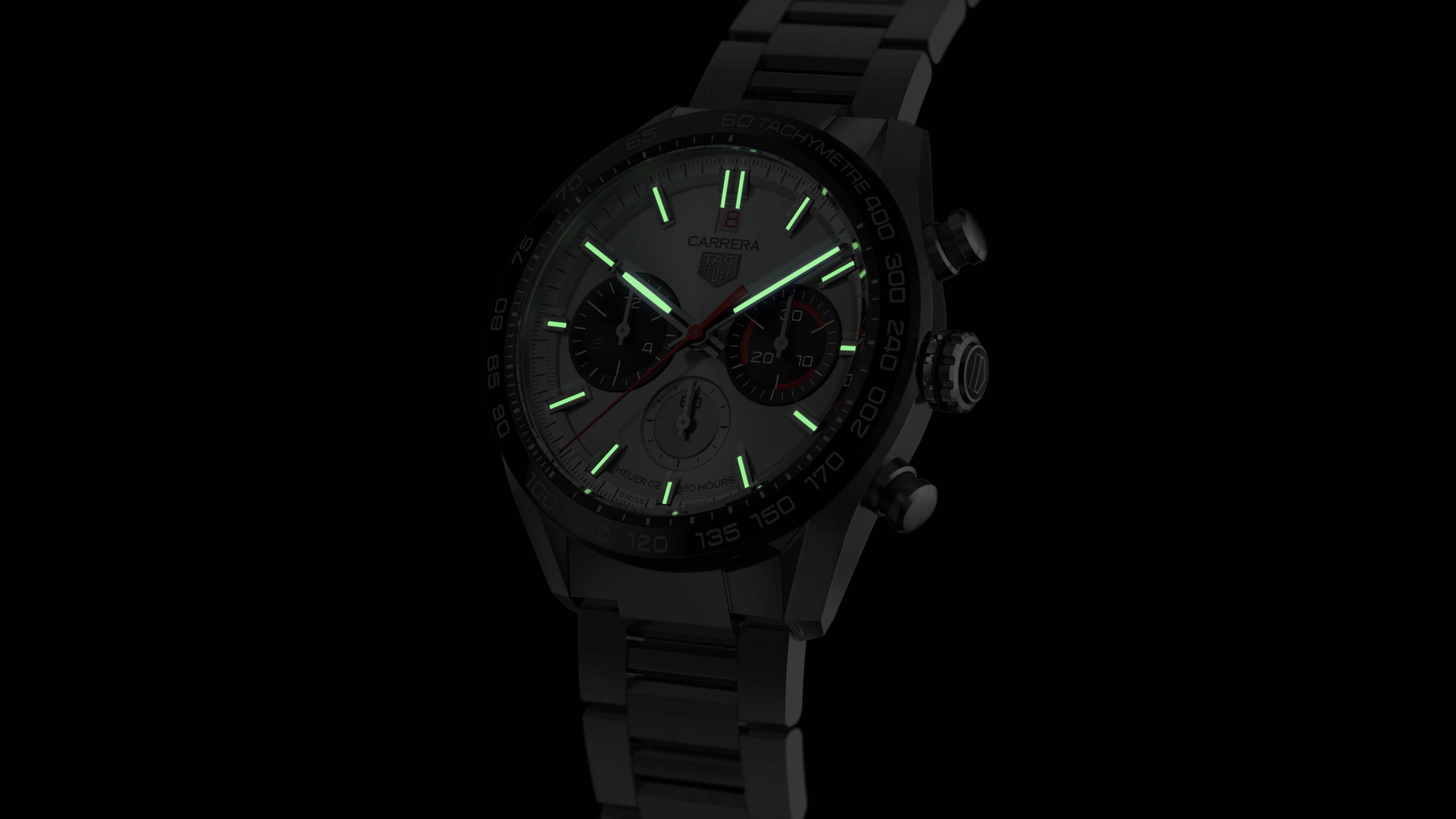 Lunar-white circular dial and jet-black minute and hour chronograph counters and bezel throw the spotlight on this Carrera’s stand-out red lacquered central hand.