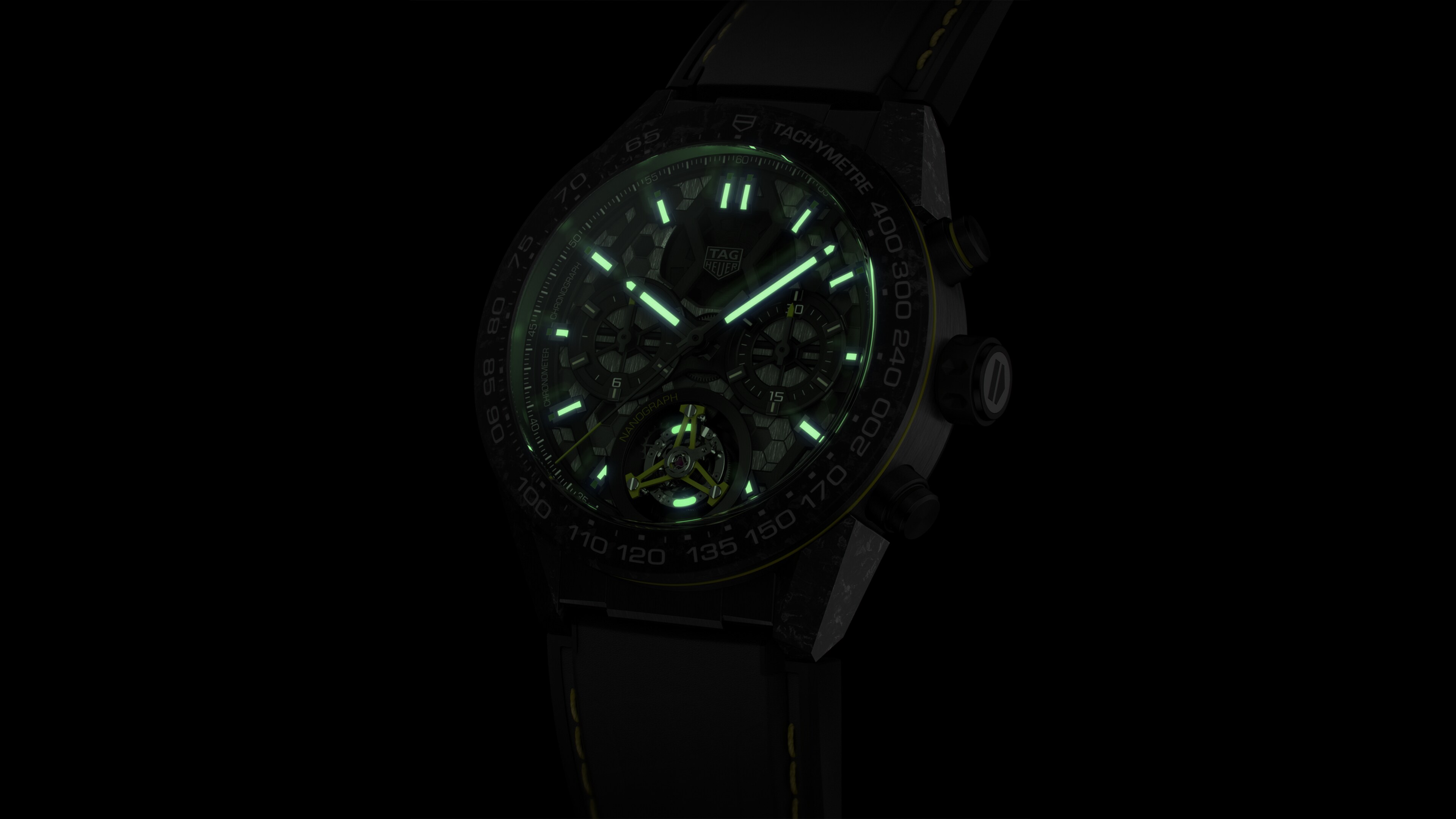Automatic, 45 mm, Titanium coated with PVD & carbon CAR5A8K.FT6172A limited edition in black and lime green colored chronograph. The flying tourbillon, the most intricate and iconic complication in haute horlogerie. A COSC-certified chronometer of extreme precision, it is an engineering marvel and a true work of art.