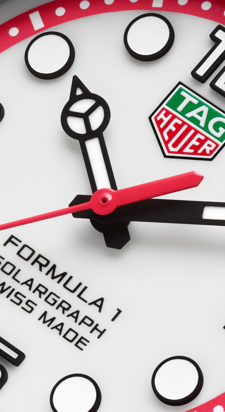 白色蛋白石质感饰面表盘与充满活力的红色外缘相得益彰,为整体设计注入了蓬勃活力,尽显大胆风范。黑色漆面指针与时标涂覆Super-LumiNova®荧光涂层,确保无论昼夜皆能清晰读时。TH-Polylight表圈为这一运动风格的美学设计融入了时尚元素,别具现代风情。