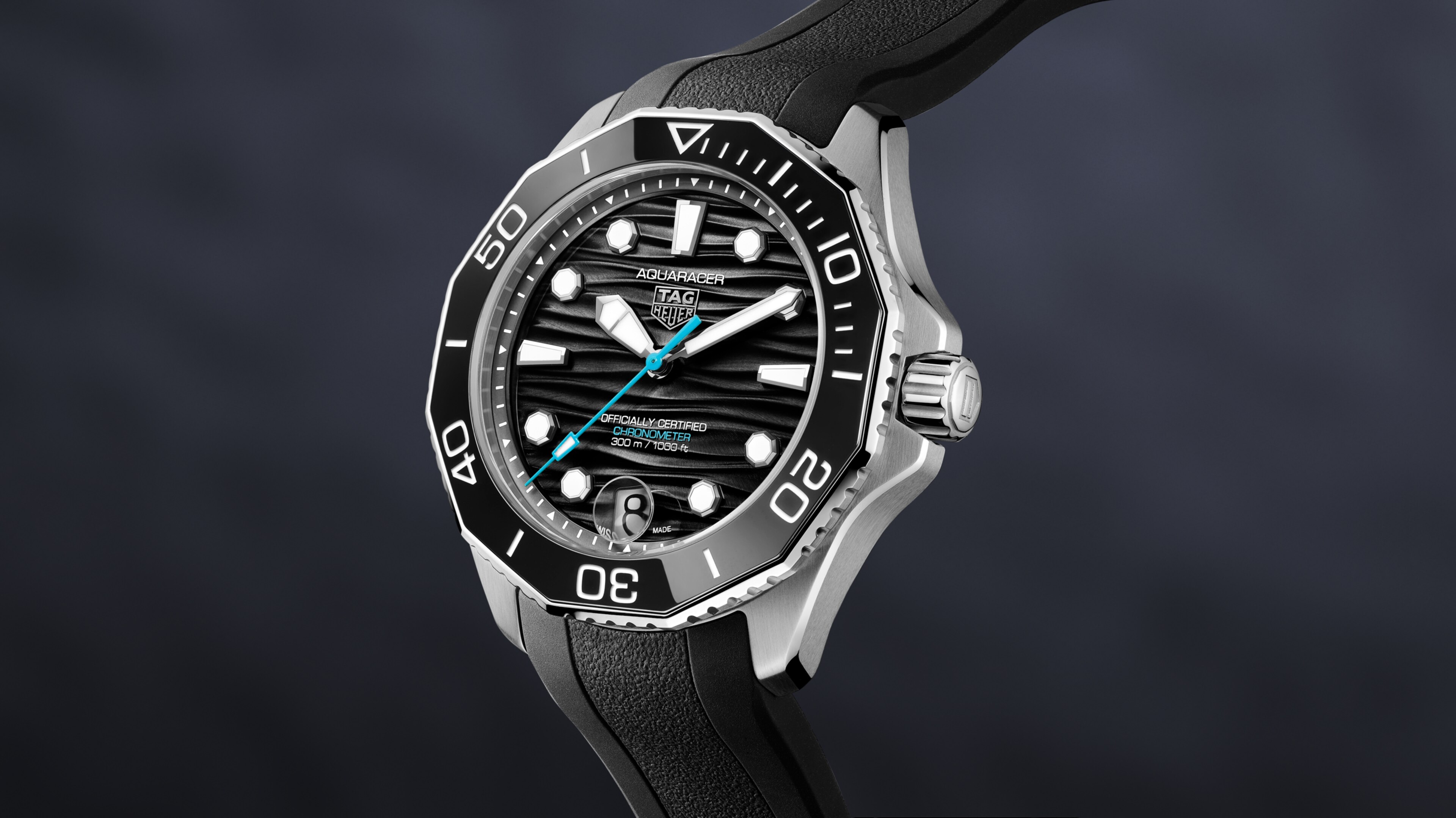 Le cadran noir au motif ondulé présente des aiguilles et des index lumineux et une aiguille centrale bleu clair évoquant les teintes des profondeurs marines. Les aiguilles revêtues de Super-LumiNova® et les index octogonaux offrent une lisibilité inégalée dans les conditions les plus sombres.