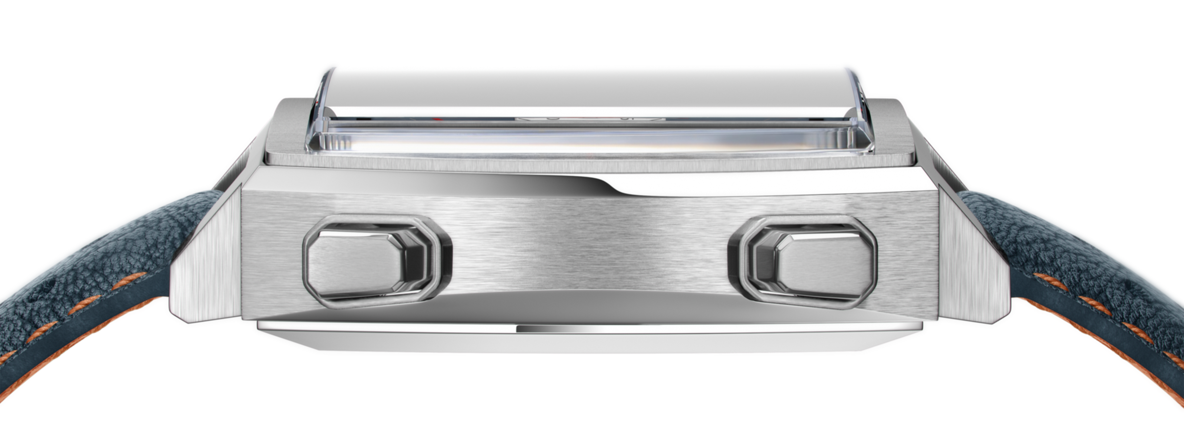 La pieza se completa con una correa de piel azul perforada con pespuntes y forro naranja, otro elegante guiño al legado de Gulf y el robusto deportivo azul y naranja de Steve McQueen, el "King of Cool".