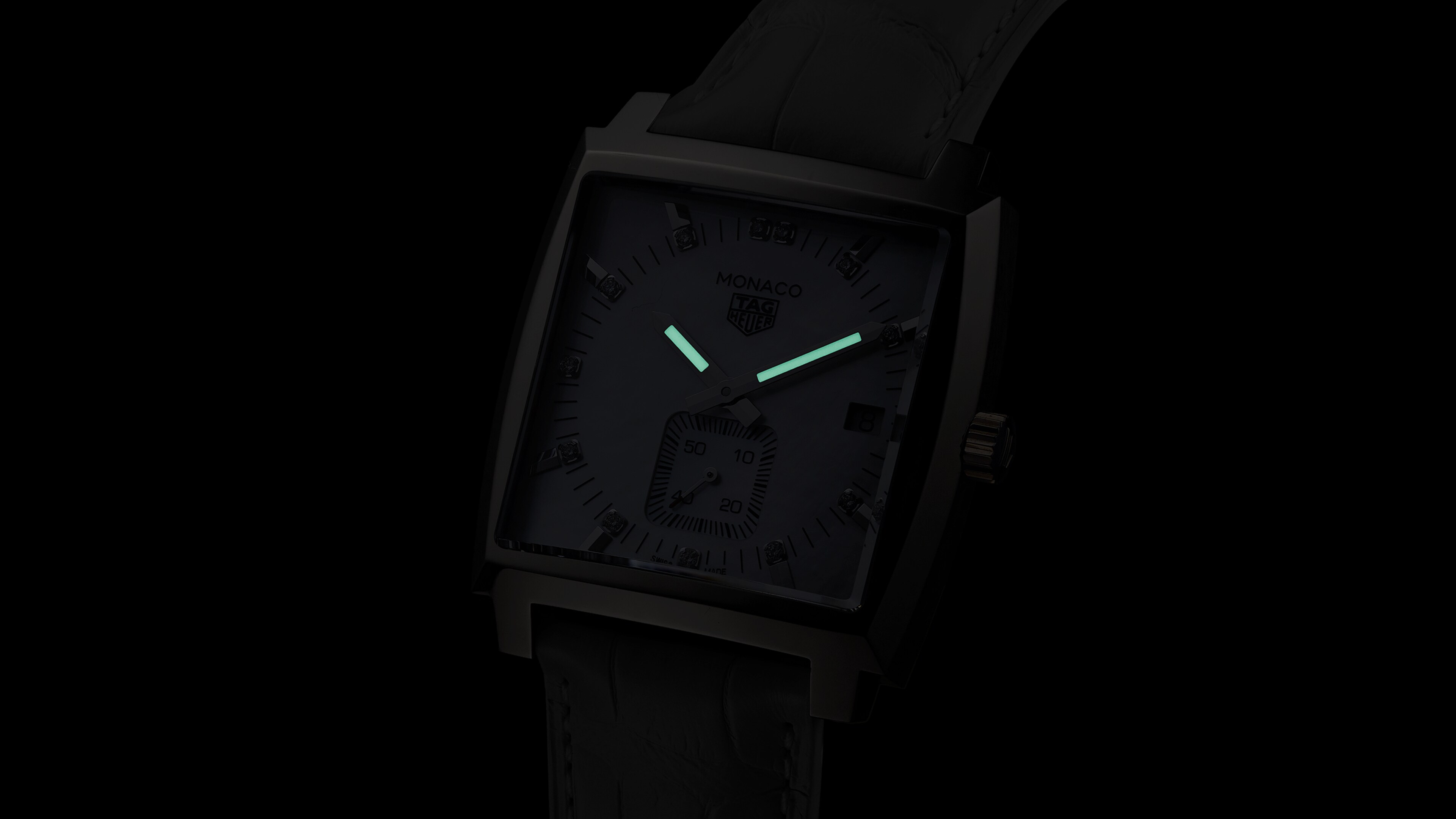 El logotipo TAG HEUER negro genera un elegante contraste con la esfera blanca de nácar. Las agujas y los índices con Super-LumiNova® chapados en rodio aportan un atractivo brillo adicional, como el segundero permanente de nácar blanco de las 6, adornado con una aguja de color rojo vivo.