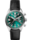 The teal green circular-brushed dial boasts a single minute chronograph counter at 3 o'clock and an angled date window at 9 o'clock, offering a pure and ultra-legible display.
