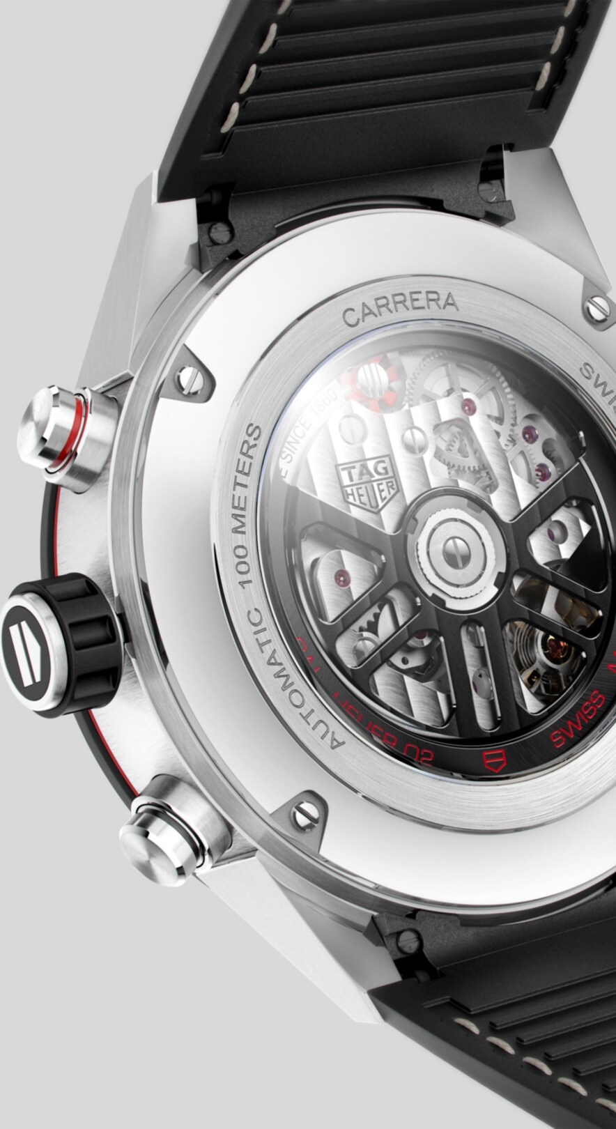 This TAG Heuer Carrera features the original chronograph counters at 3, 6 and 9 o’clock. The skeleton dial is protected by a curved sapphire crystal water resistant to 100 meters. The power reserve is 80 hours.