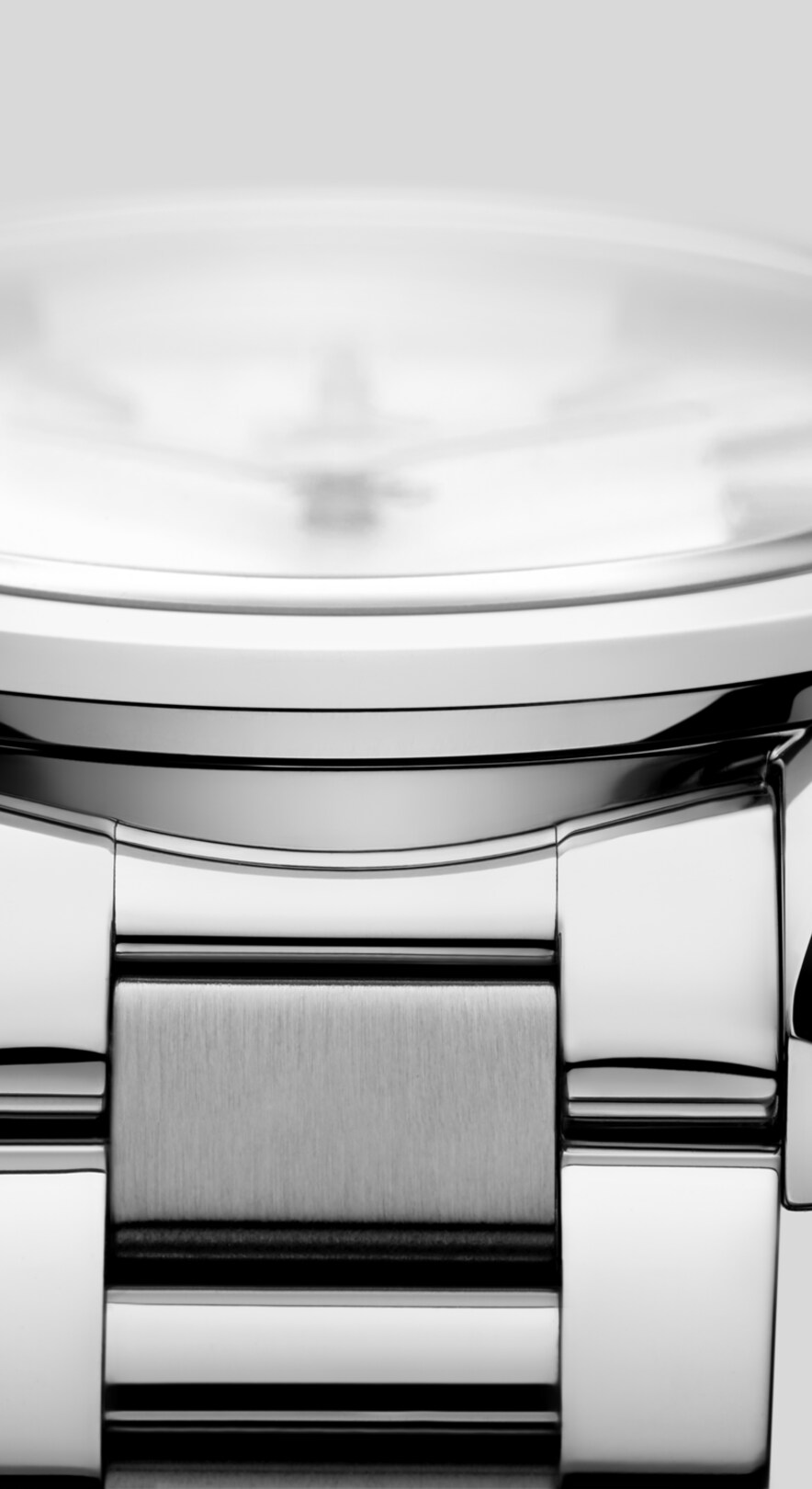 The 3-row steel bracelet is fine-brushed and polished to an alluring sheen. The silver-toned indexes catch the light. Both contrast beautifully with the glowing tones of the mother of pearl dial.