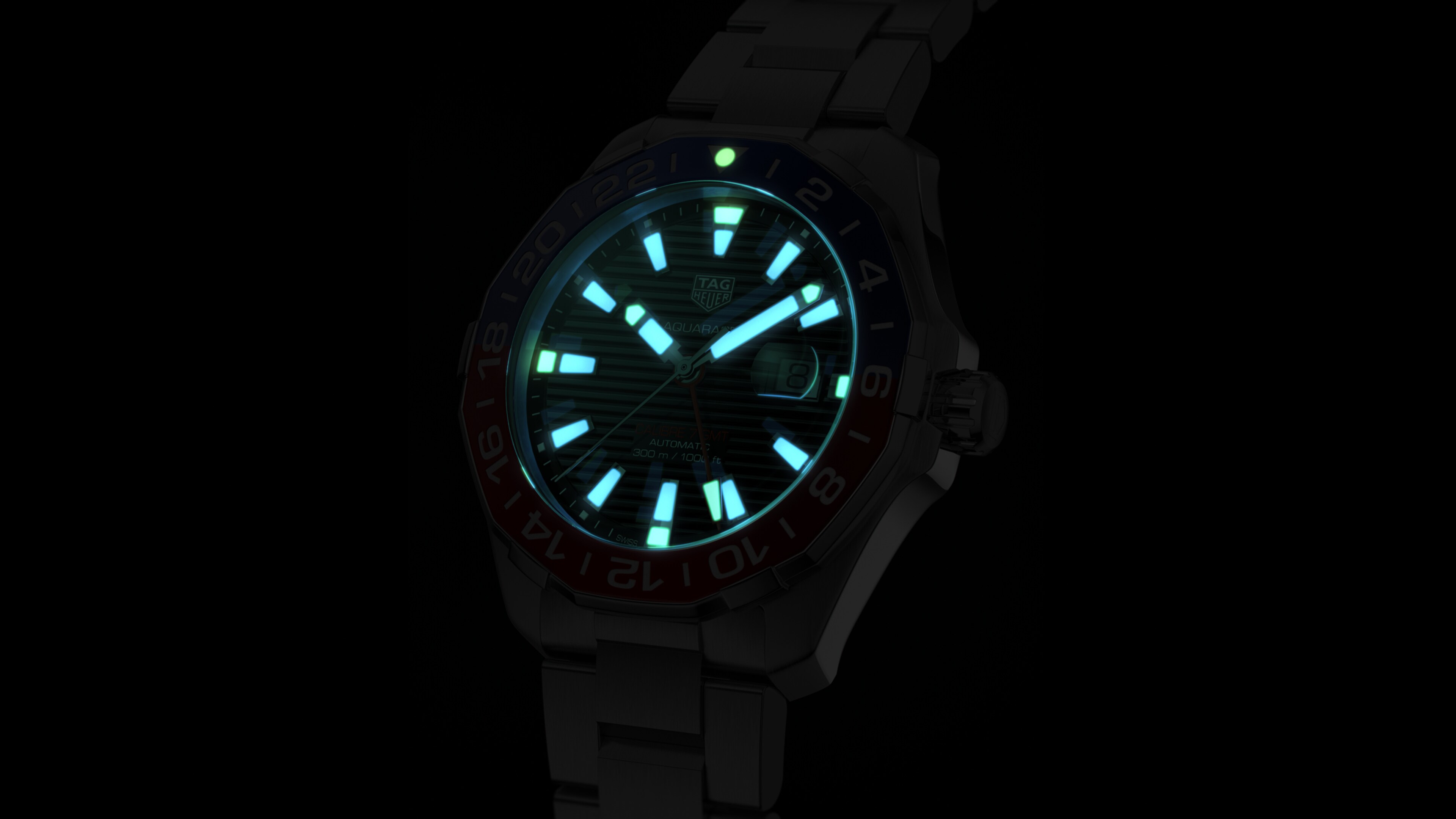 Automático, 43 mm, Acero WAY201F.BA0927Un modelo Aquaracer impulsado por el Calibre 7 GMT con una amplia caja de 43 mm y un bisel de dos colores con función GMT para indicar zonas horarias adicionales. Las distintivas franjas horizontales de la esfera y los marcadores luminiscentes especiales sobre agujas e índices favorecen la legibilidad en condiciones de escasa luz o bajo el agua.