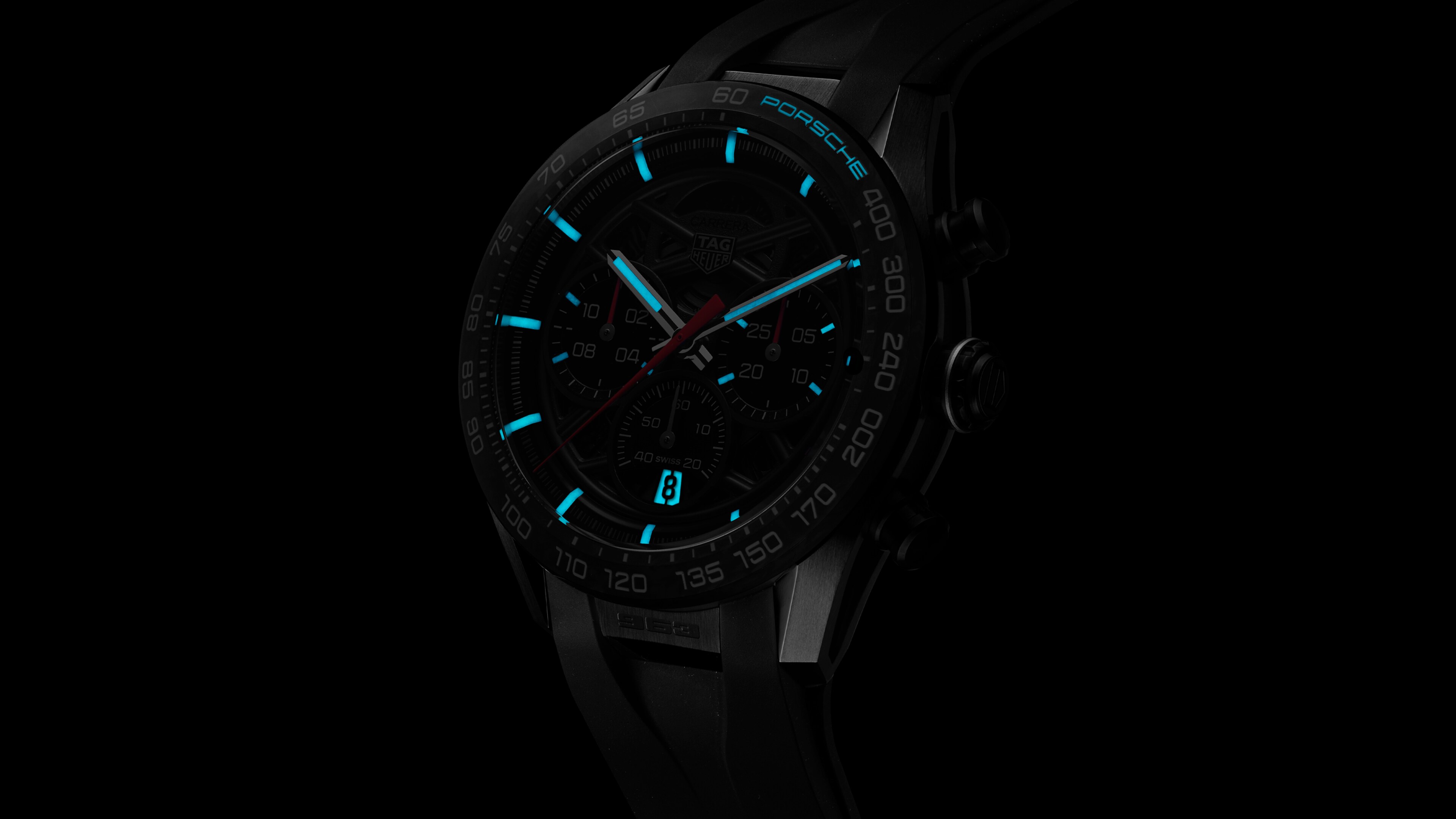 La atrevida esfera esqueleto, que recuerda al diseño tubular del chasis de los coches de carreras de Porsche, se combina con un bisel de carbono forjado negro con el logotipo de Porsche en blanco. Un diseño preparado para la alta velocidad.