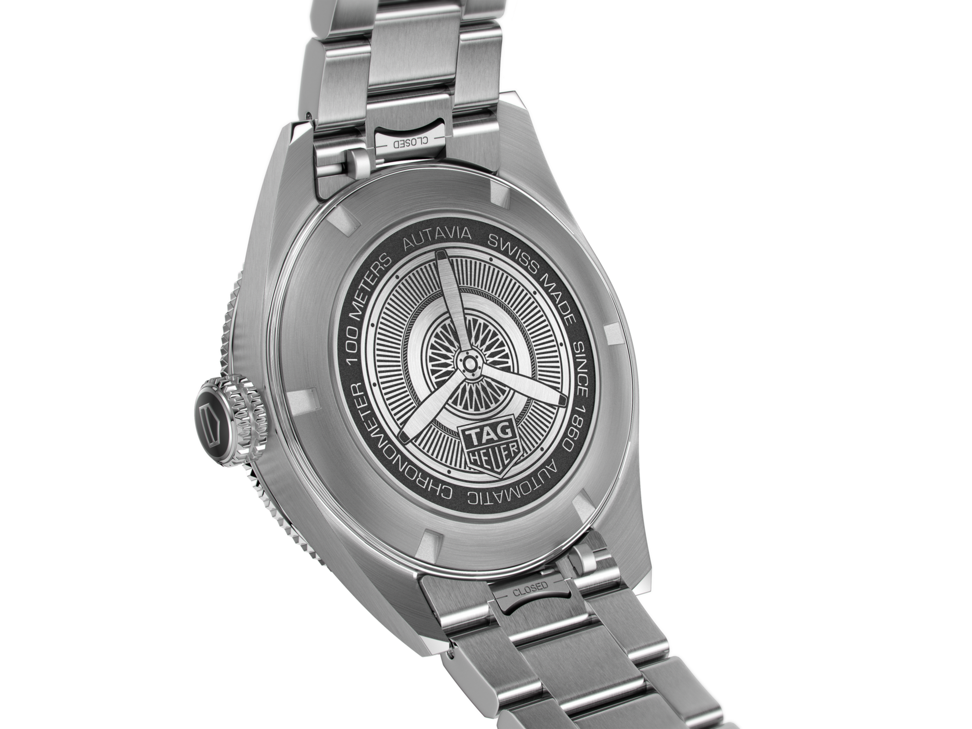 A curved double anti-reflective sapphire crystal further emphasize the Autavia’s at-a-glance readability. Vintage-inspired white Super-LumiNova® lume fills the polished hands and markers.