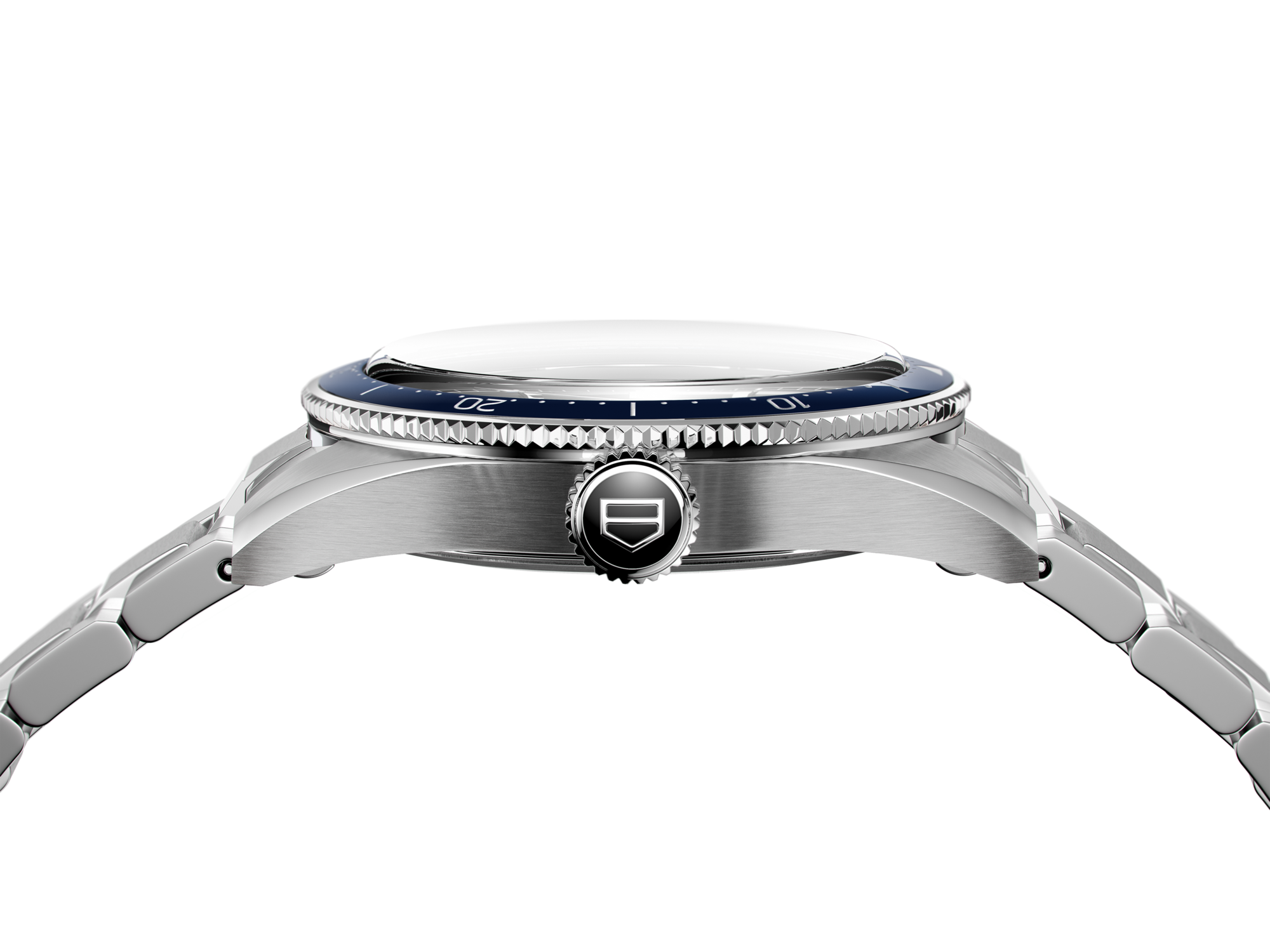 The automatic has a broad 42mm case in hand-polished and fine-brushed steel, matched to a blue ceramic bidirectional turning bezel. The date window stands out on the clean dial design at 6 o’clock.