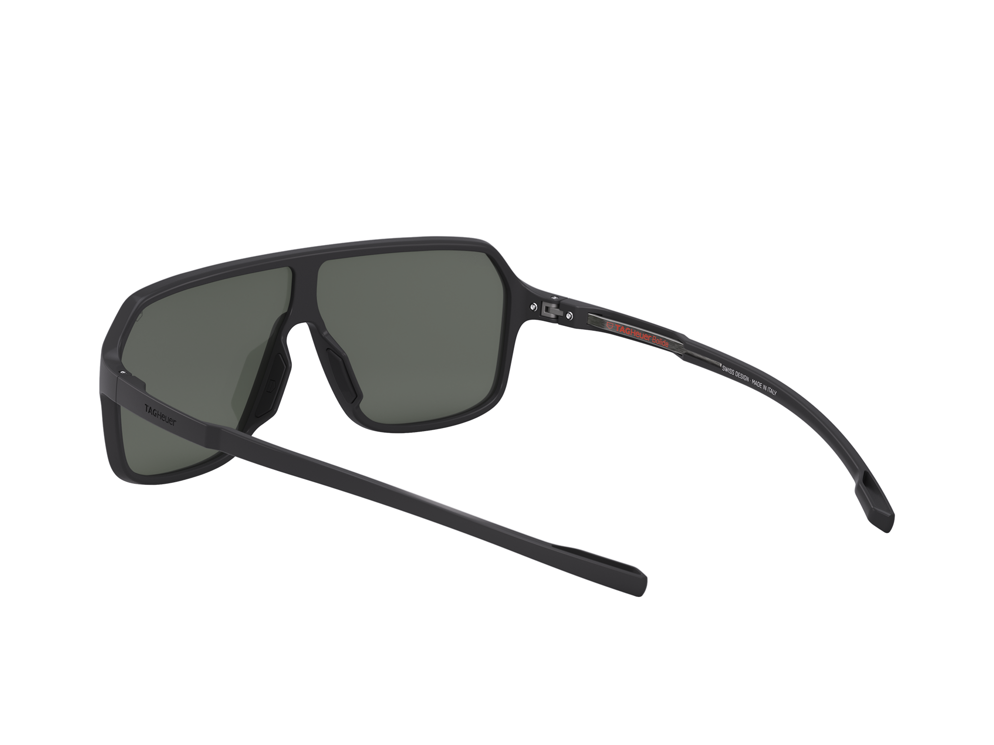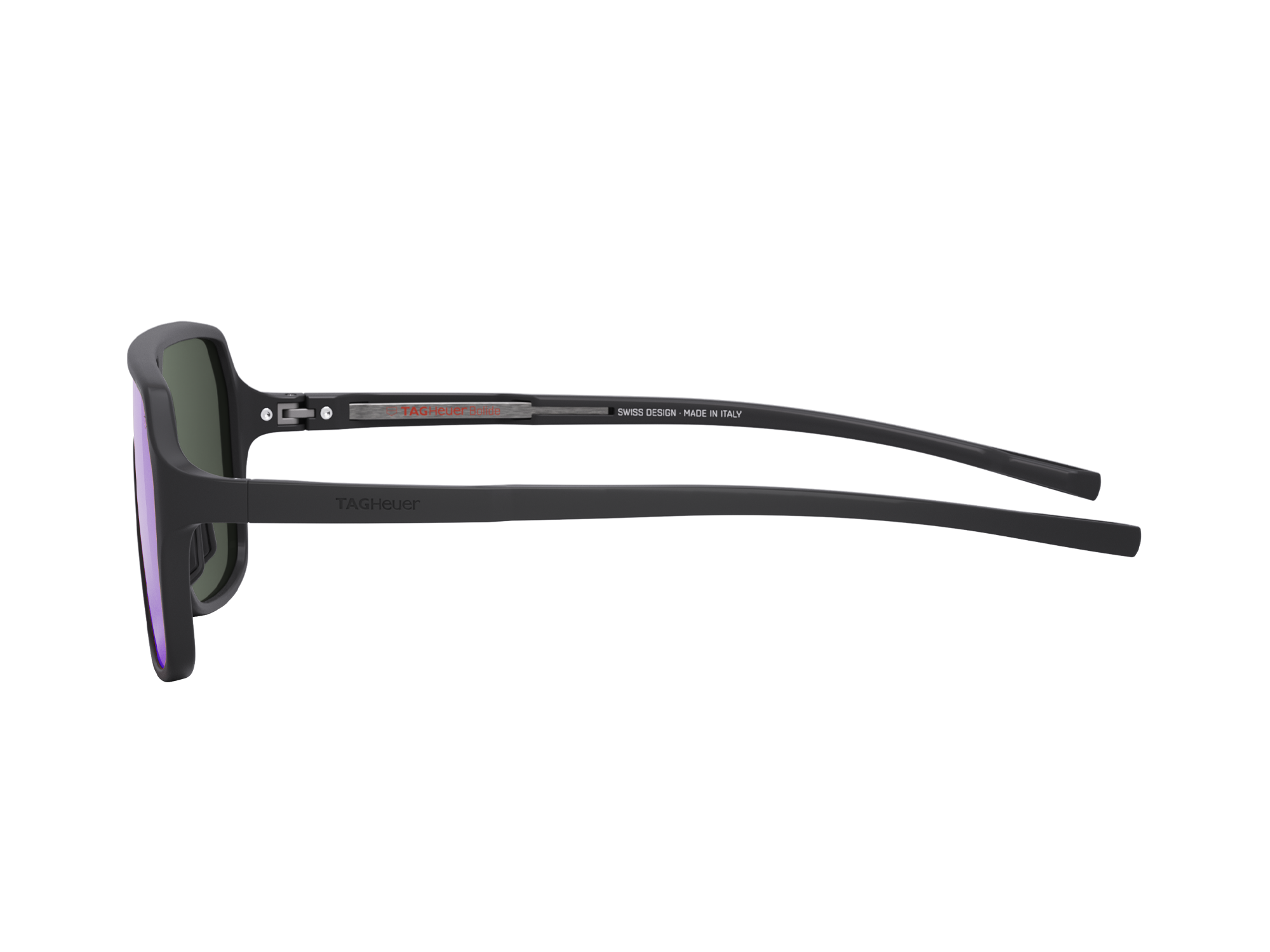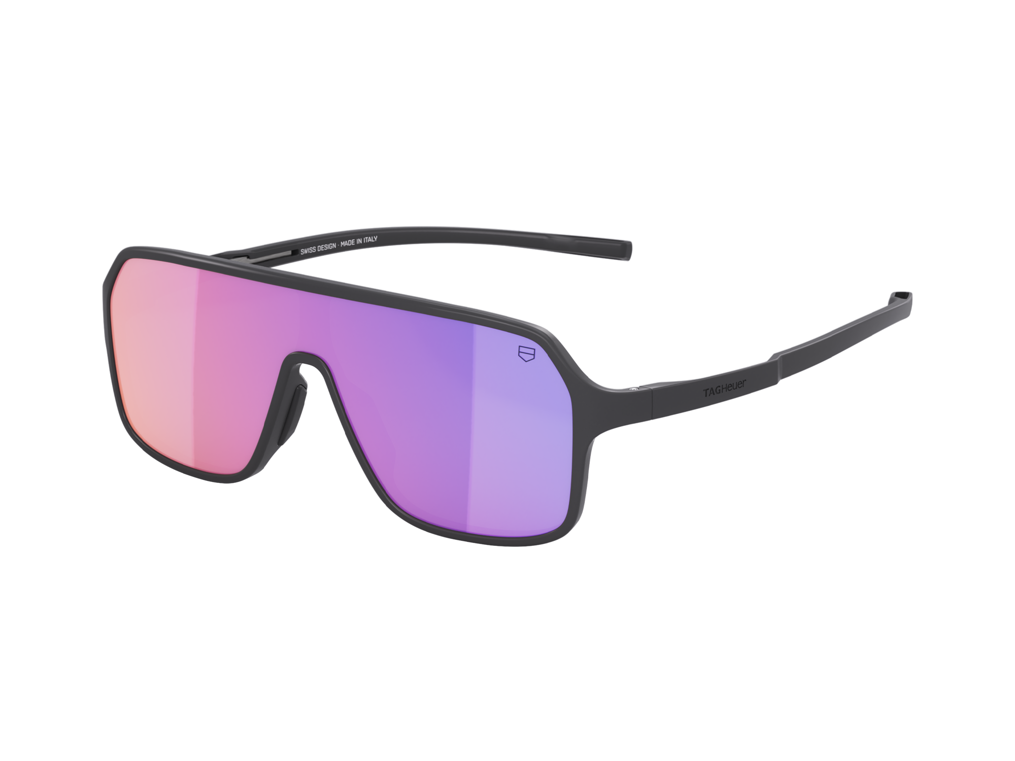 Equipados com hastes resistentes e charneiras de titânio, estes óculos de sol TAG Heuer BOLIDE apresentam uma armação de bio-nylon preto semifosco que combina perfeitamente com as lentes cinza e seu toque vermelho/violeta, oferecendo clareza em qualquer ambiente - uma obra-prima de design e funcionalidade.