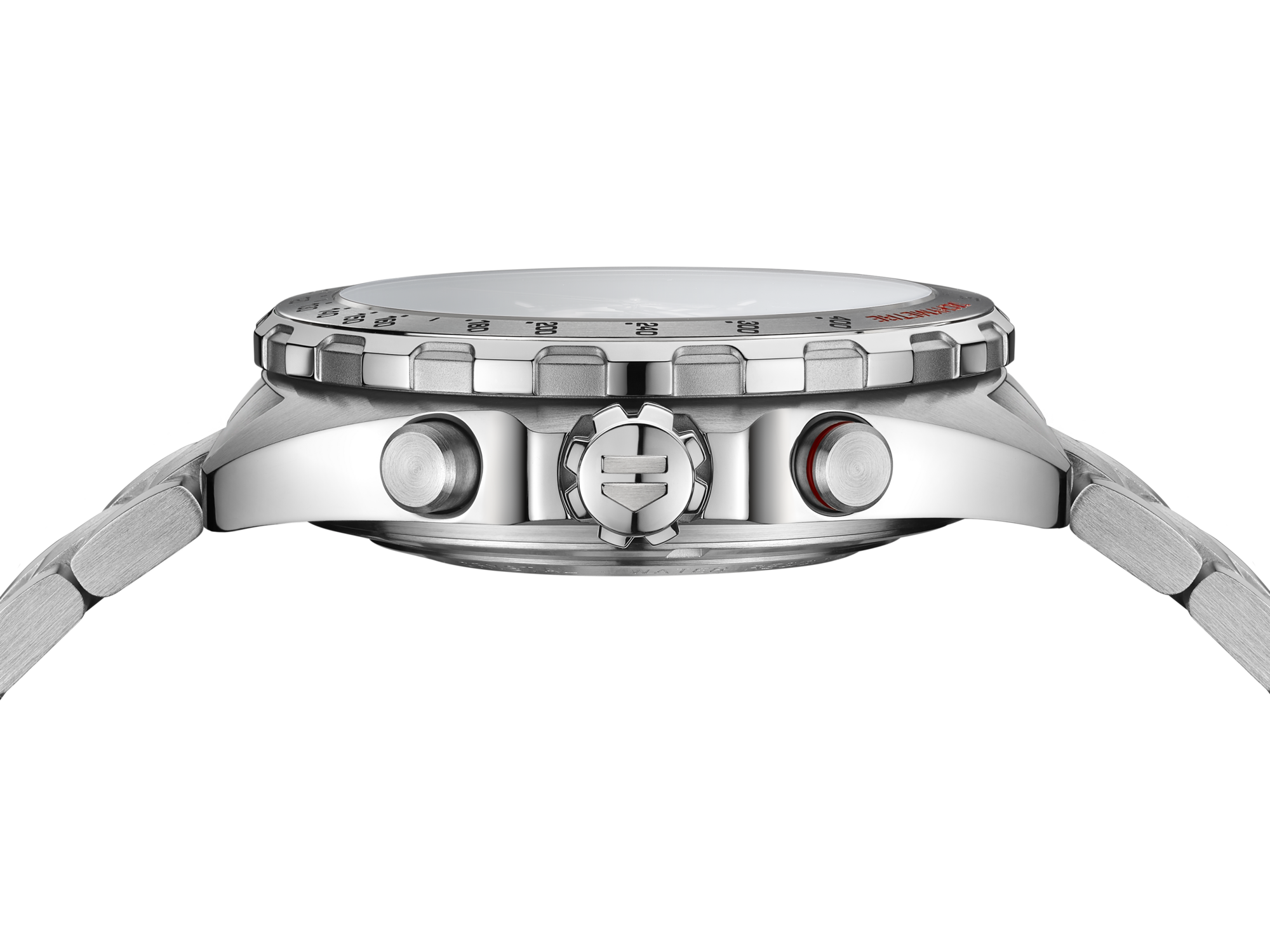 Equipado com o durável movimento Calibre 16, o relógio esportivo casual tem uma pulseira em metal de alta tecnologia com extensão para piloto que se ajusta sobre a manga de um macacão de corrida. Extremamente resistente a impactos, ele é submetido a mais de 60 testes de qualidade antes de ser considerado digno para pegar estrada.