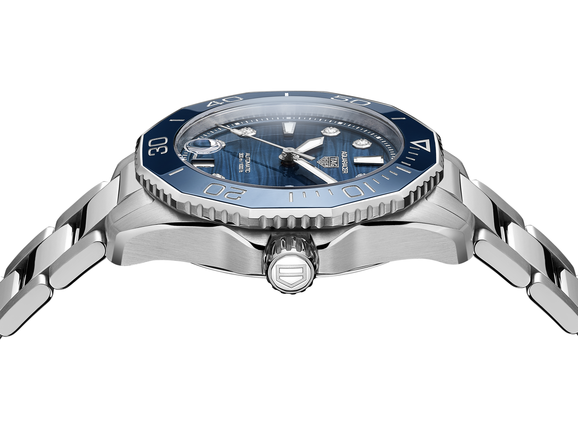 True to the iconic Aquaracer heritage, the new 36mm slim case combines brushed and polished surfaces with sharp geometry.