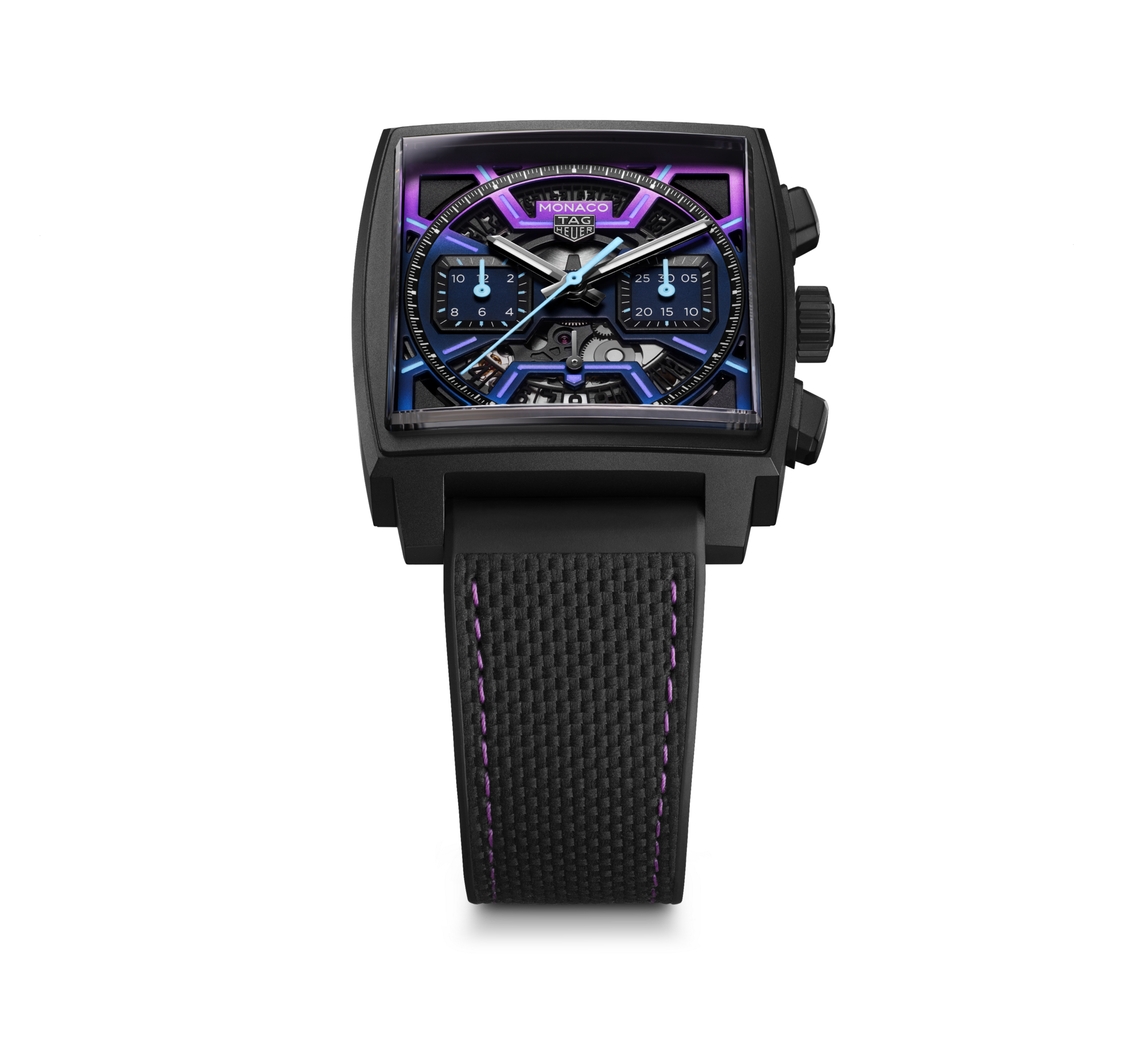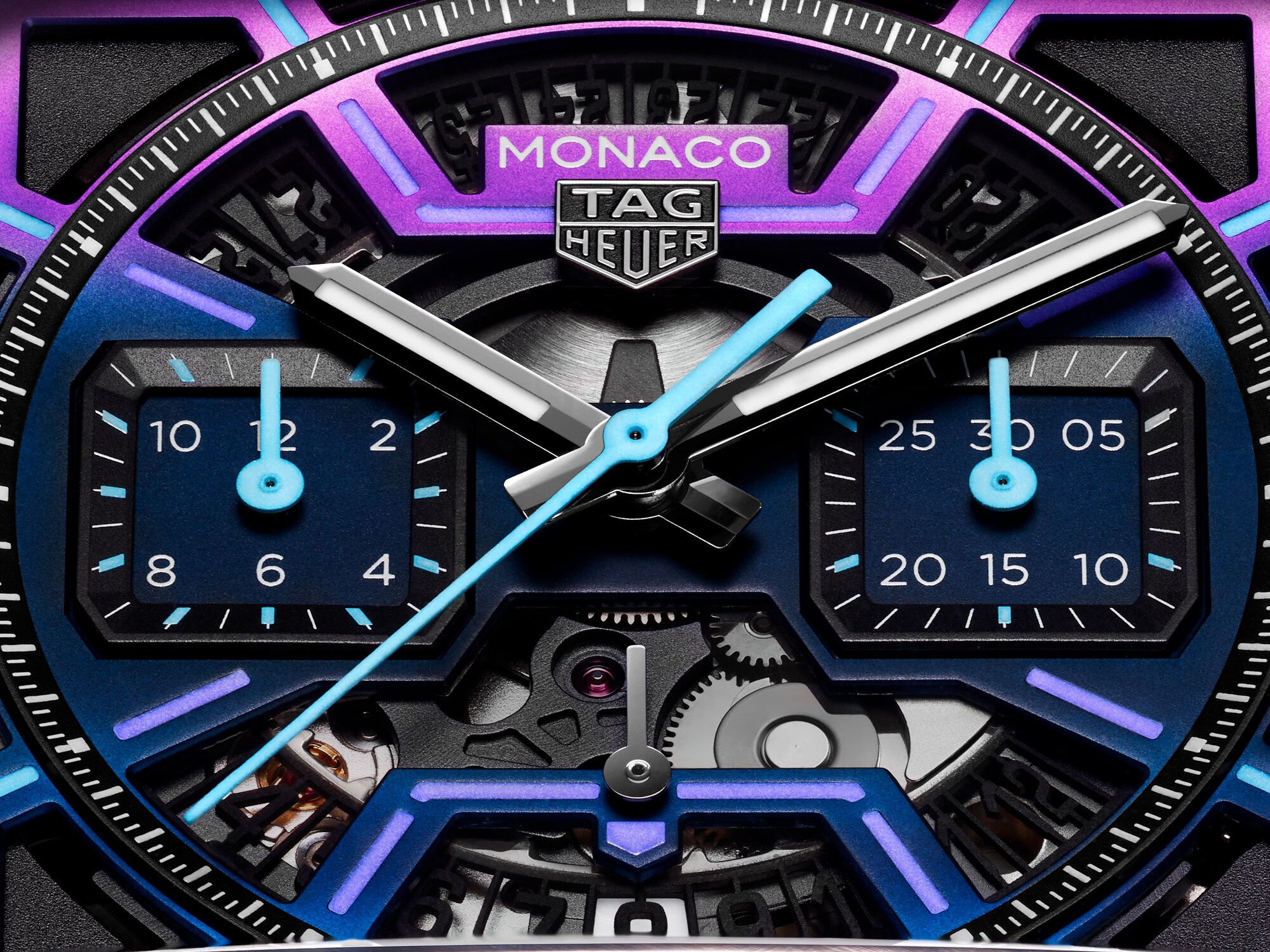 The skeletonized dial boasts a powerful gradient from purple to blue, accompanied by striking luminescent accents that evoke Las Vegas's dazzling nightlife. The bright turquoise chronograph hands further electrify the design while offering perfect legibility.