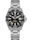 In three-row fine-brushed steel, with folding clasp and safety push buttons to prevent accidental opening, and an integrated diver extension that allows it to be worn over a wet suit for diving or surfing.