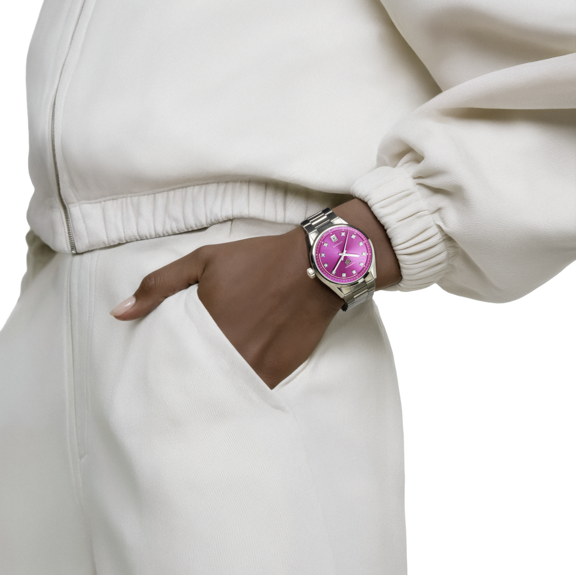Experience timeless elegance with the TAG Heuer Carrera Date, featuring a captivating 36mm steel case and a vibrant pink snail-brushed dial that radiates feminine charm. This bold timepiece is adorned with 11 VS diamonds totaling 0.22 ct set as hour markers, enhancing its luxurious appeal.