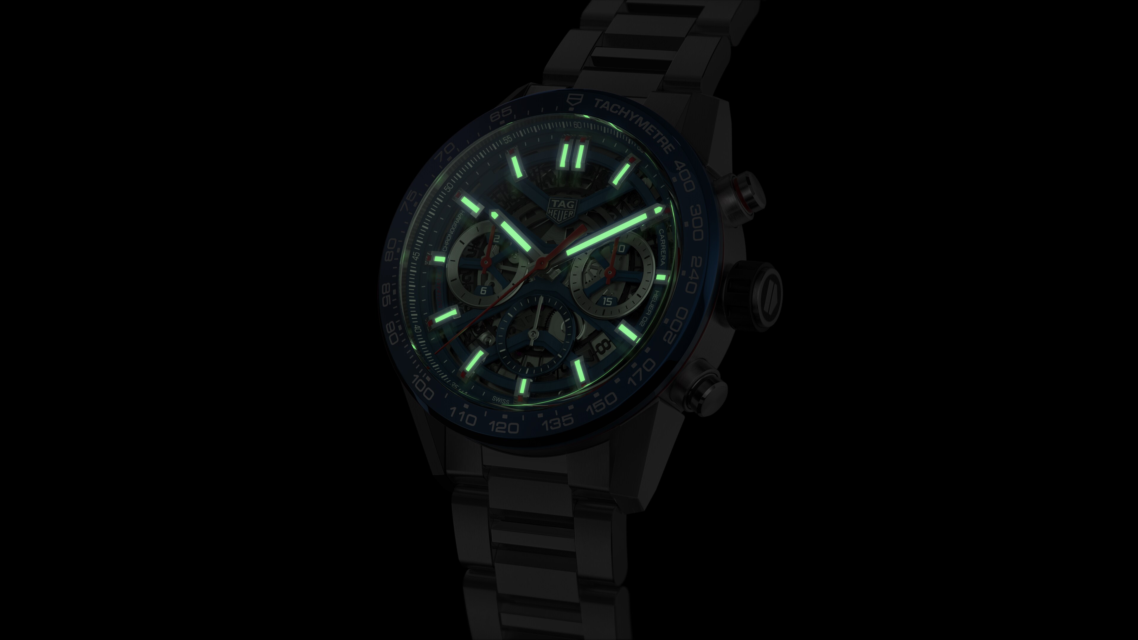 Water-resistant to 100 meters, the skeleton dial and screw-in sapphire case back offer dazzling views of the in-house manufactured Heuer-02 movement, which provide a 80 hours power reserve.