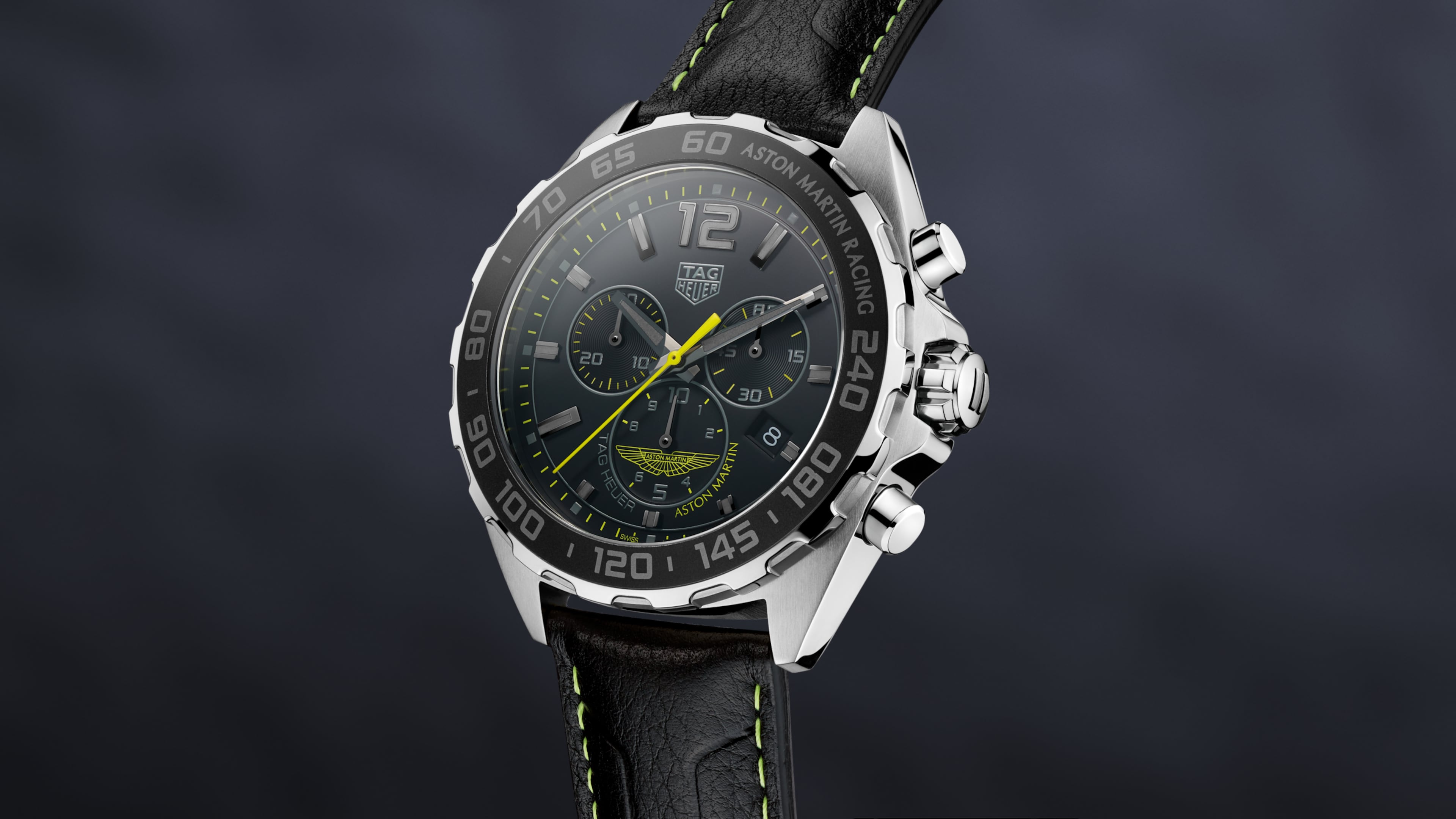 The indexes, seconds hand and Aston Martin's famous winged logo are in the racing team’s signature lime green, sharply contrasted with the all-black dial. The magnificent black leather strap topstitched in the racing legend’s iconic shade of lime green.