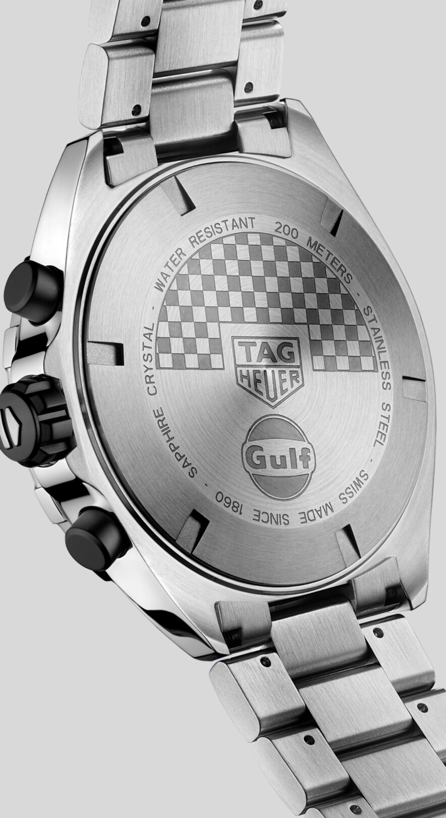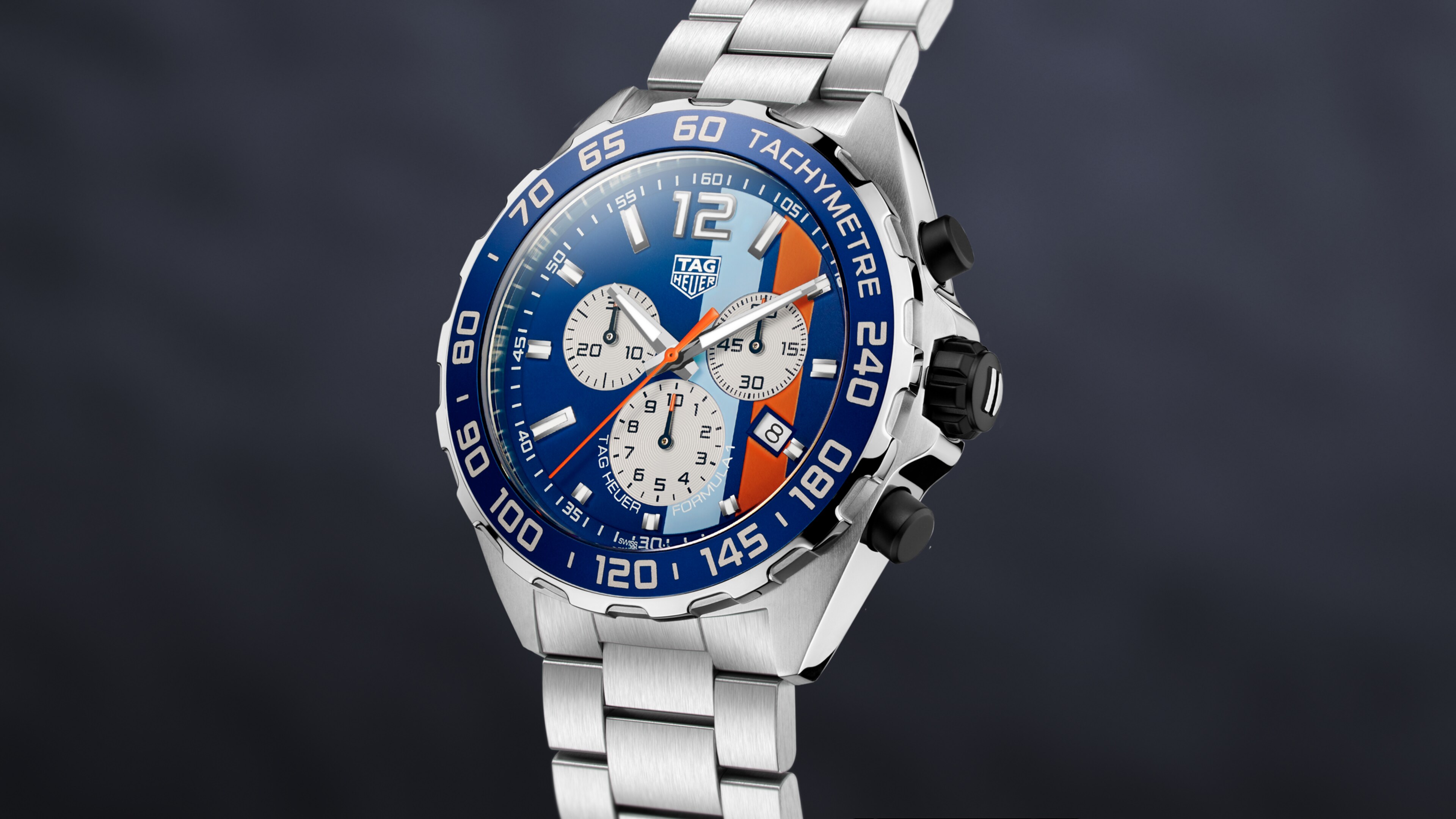 A luxury steel case with the Gulf logo on its back and a deep blue dial with the iconic light blue and orange Gulf stripes; this exclusive timepiece embodies the spirit of motor racing.