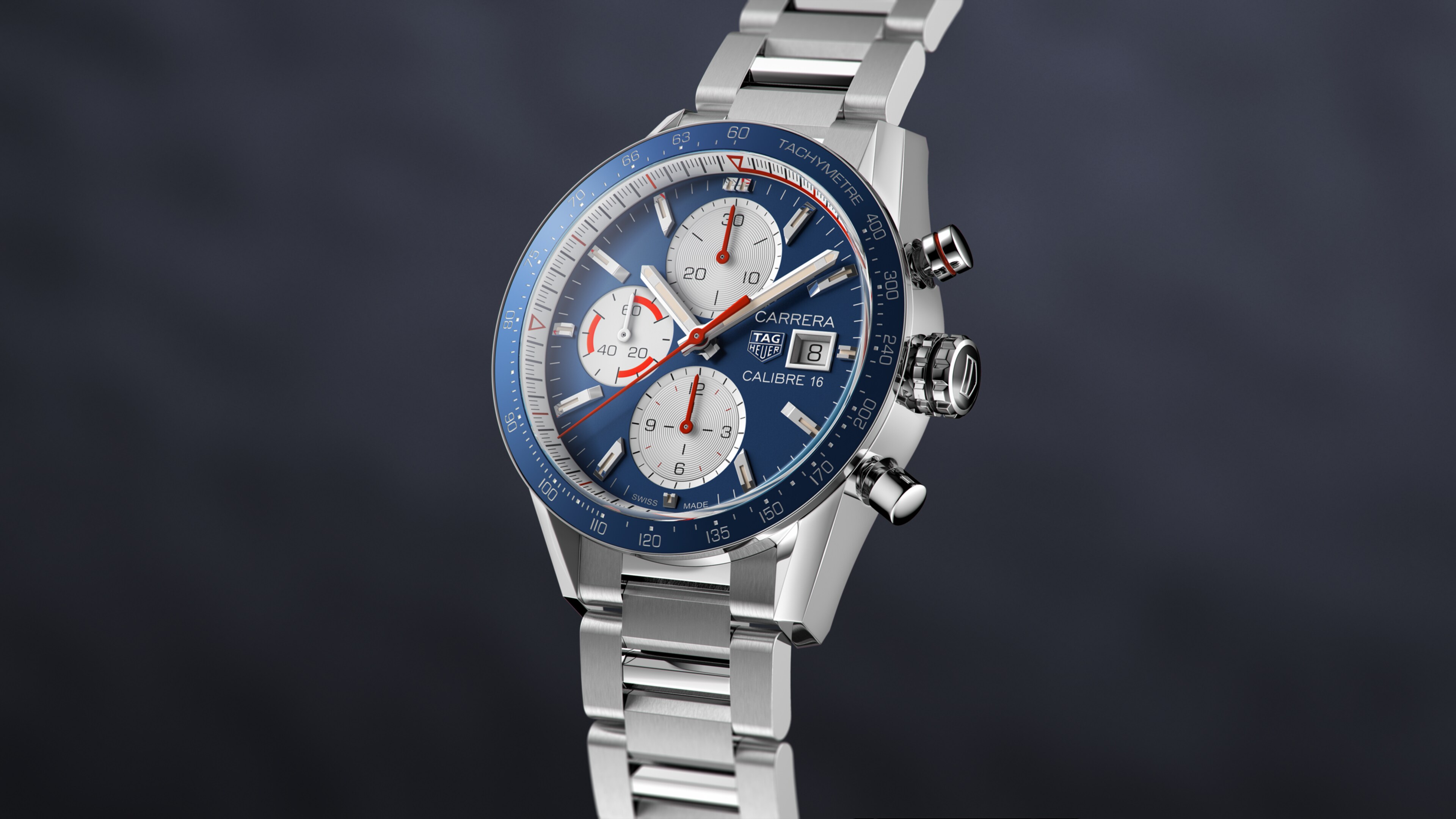 Automatic, 41 mm, Steel CV201AR.BA0715A stunning 41mm TAG Heuer Carrera chronograph powered by the Calibre 16 automatic movement. The blue and white design is punctuated by red lacquered hands on the azurage counters at 12 and 6 and the sweeping seconds hand.