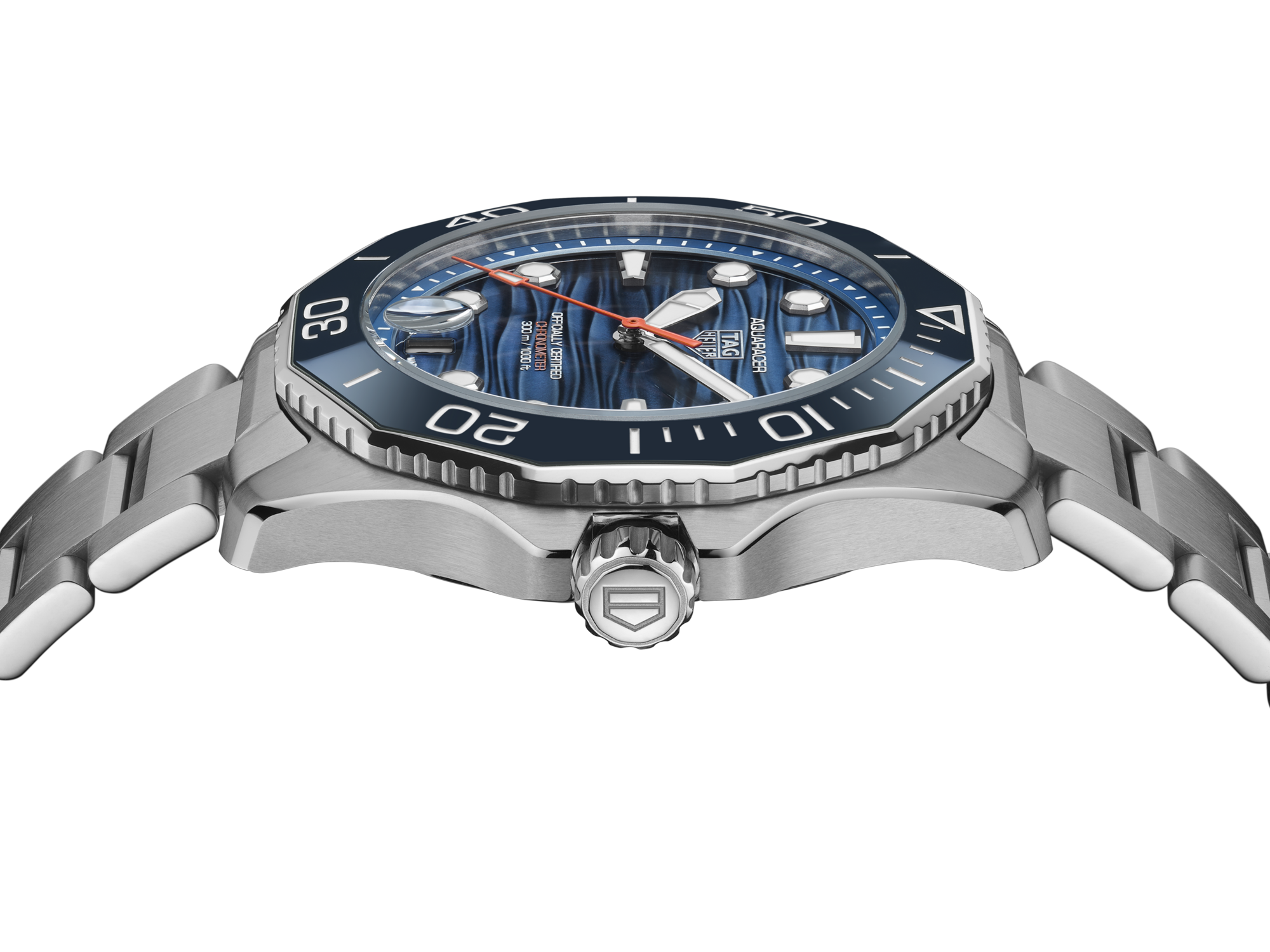 The fine-brushed, polished steel case houses a ceramic blue 60-minute scale unidirectional bezel, offering advanced ergonomics and a tactile turning experience.