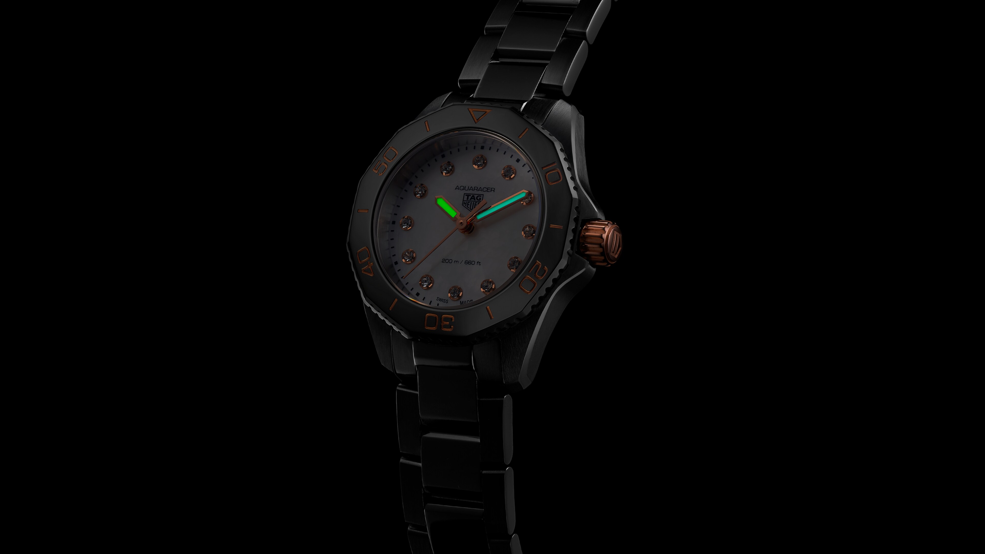 这款TAG Heuer Aquaracer(竞潜系列)腕表,搭配纤细的锥形精钢表链与舒适的延长链节,一往无前。