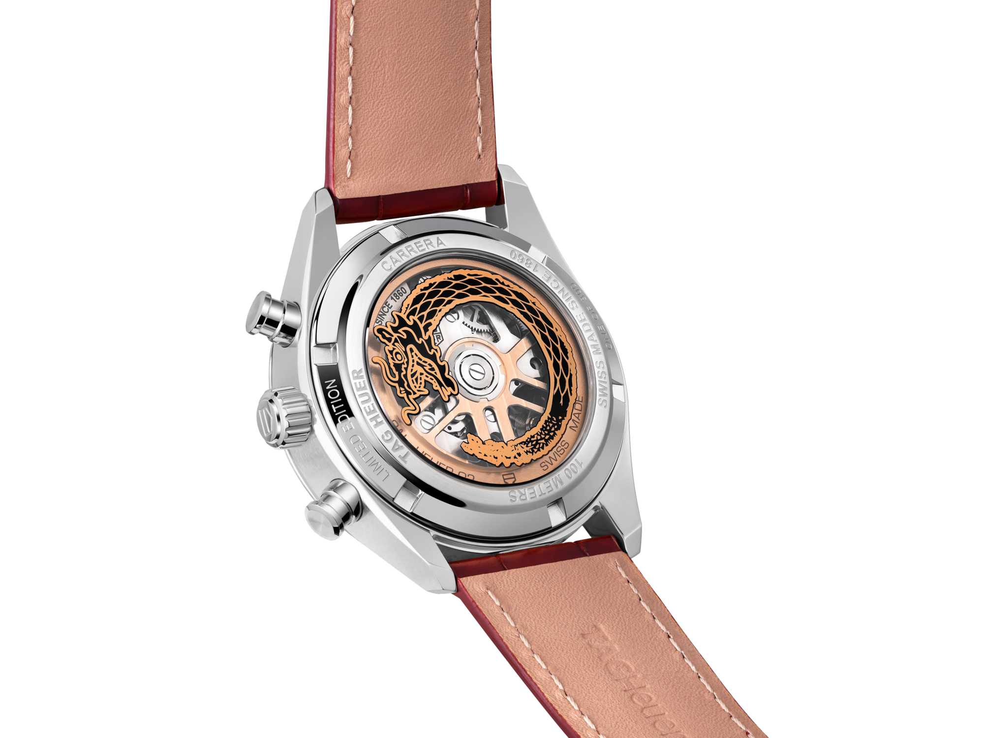 蓝宝石表背上印制了别具一格的中国龙图案,镌刻的“One of 300”字样锦上添花,防水深度可达100米。
