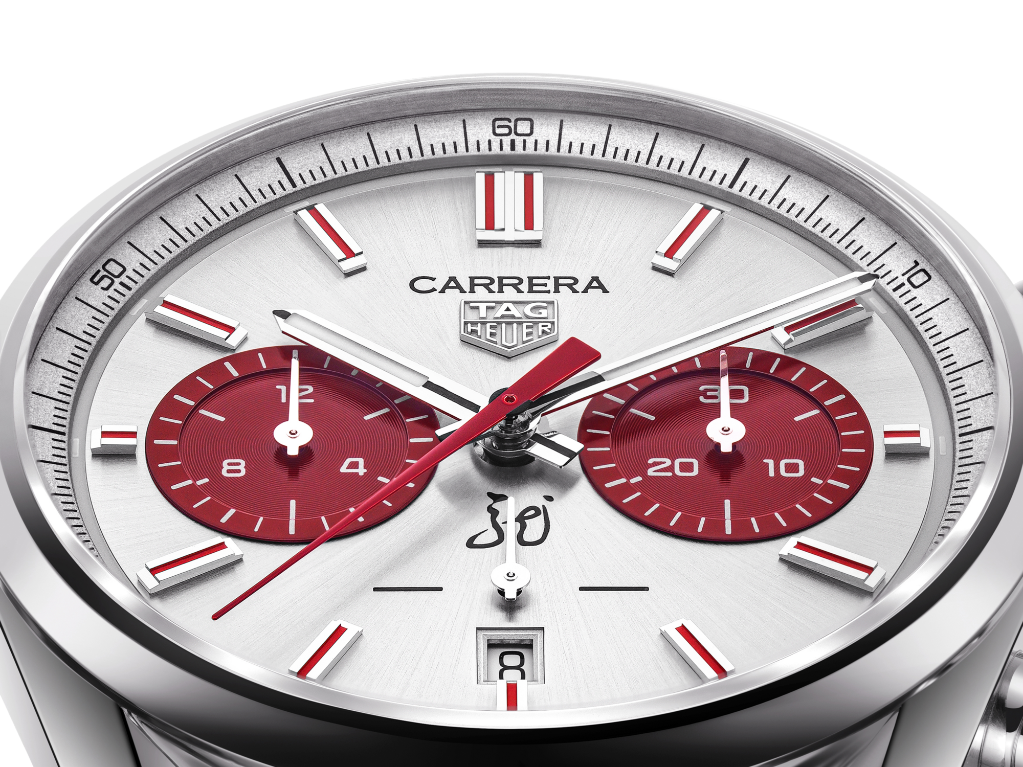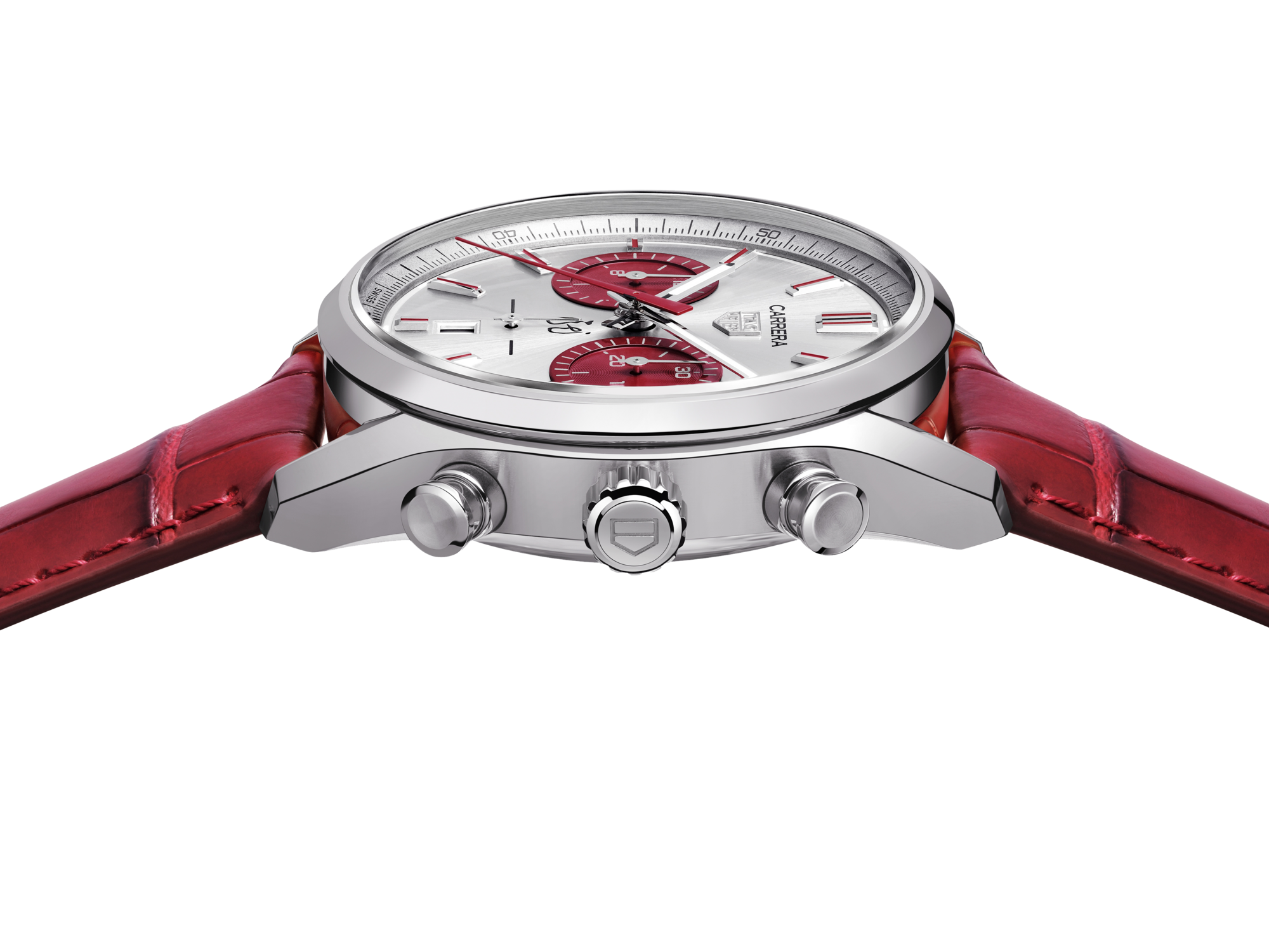 银色太阳纹磨砂表盘与3点和9点钟位置的红色“azurage”子表盘形成鲜明对比,大胆演绎卡莱拉标志性的反转“熊猫”表盘设计。