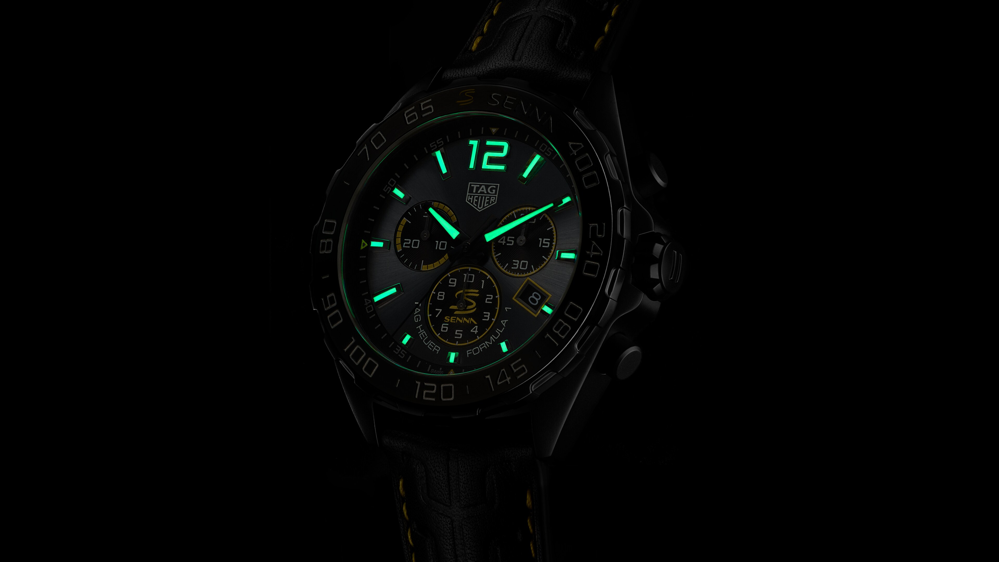 烟灰色太阳纹磨砂表盘设计鲜明,与表盘、日历视窗、陶瓷测速刻度表圈,以及表带上洋溢活力的黄色点缀相得益彰。