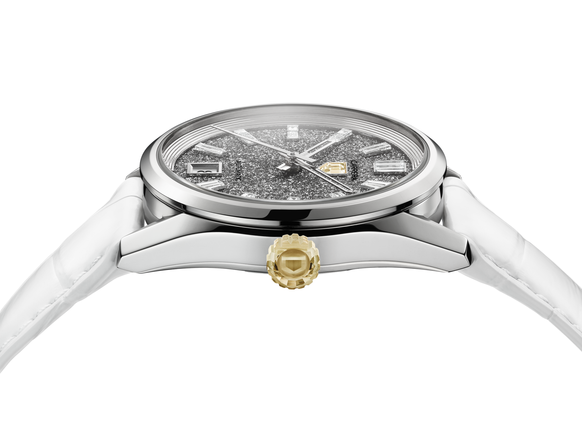 多晶體鑽石錶面(2.9克拉)營造出璀璨視覺效果,並以12顆長方形切割實驗室培育白鑽(0.5克拉)作為刻度。引人矚目的黃鑽錶冠(1.3克拉)和TAG Heuer 泰格豪雅盾形標誌(0.1克拉)則為非凡錶款增添非凡風格。