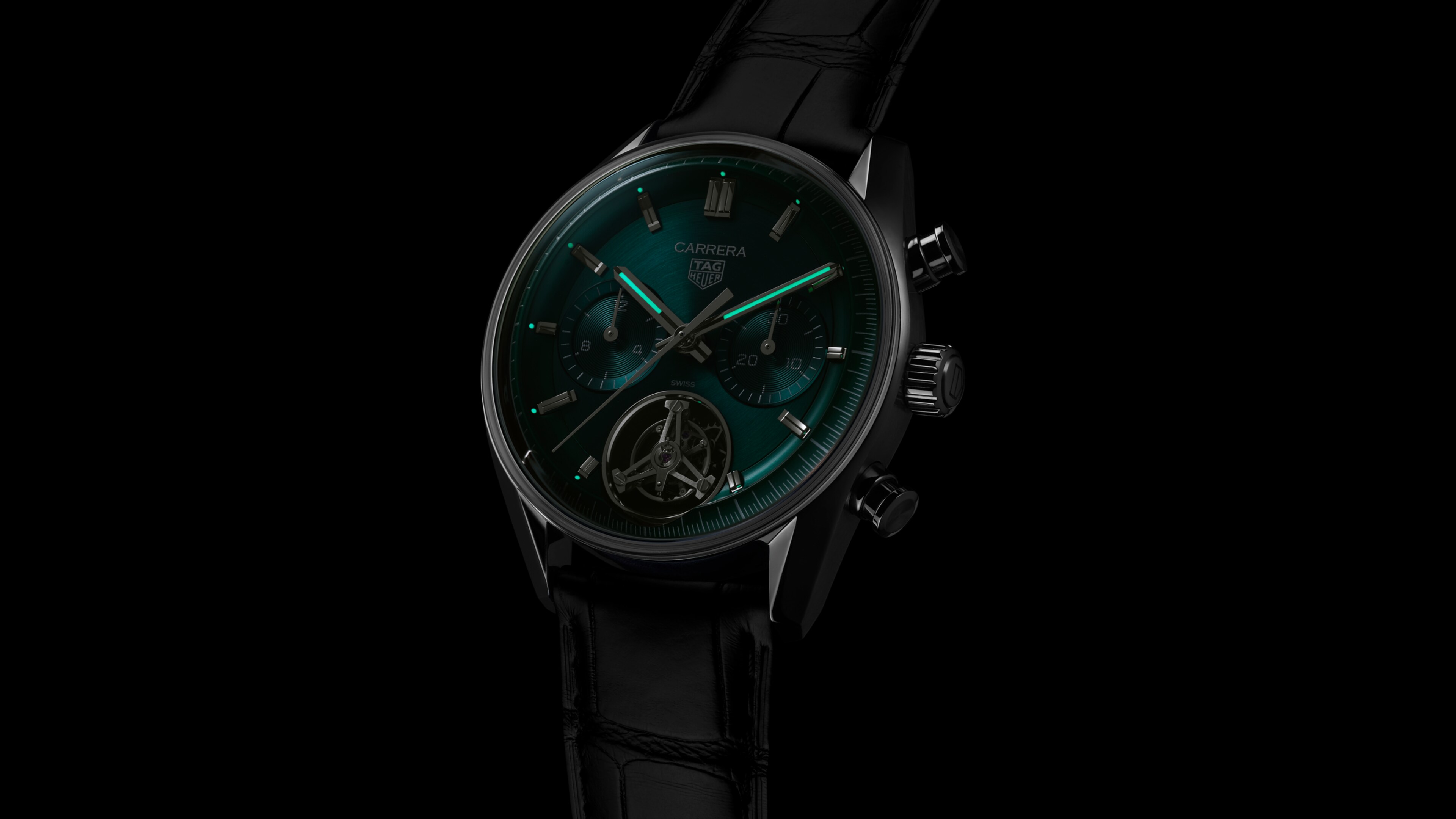 自動, 42 mm, 精鋼 CBS5011.FC6566隆重介紹矚目迷人的42毫米版TAG Heuer Carrera(卡萊拉)陀飛輪計時腕錶。設計採用鮮明突出的藍綠色單色錶面,充分體現精準計時的精髓。配備黑色鱷魚皮錶帶,讓您全速馳騁兼展現格調。