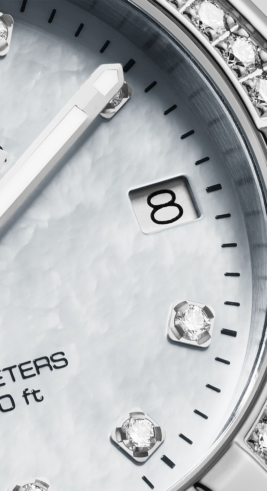 35 diamonds shimmer on the steel unidirectional turning bezel. Another 11 catch the light on the hour markers. Their brilliance is reinforced by the white mother of pearl, giving unique shades to the dial.