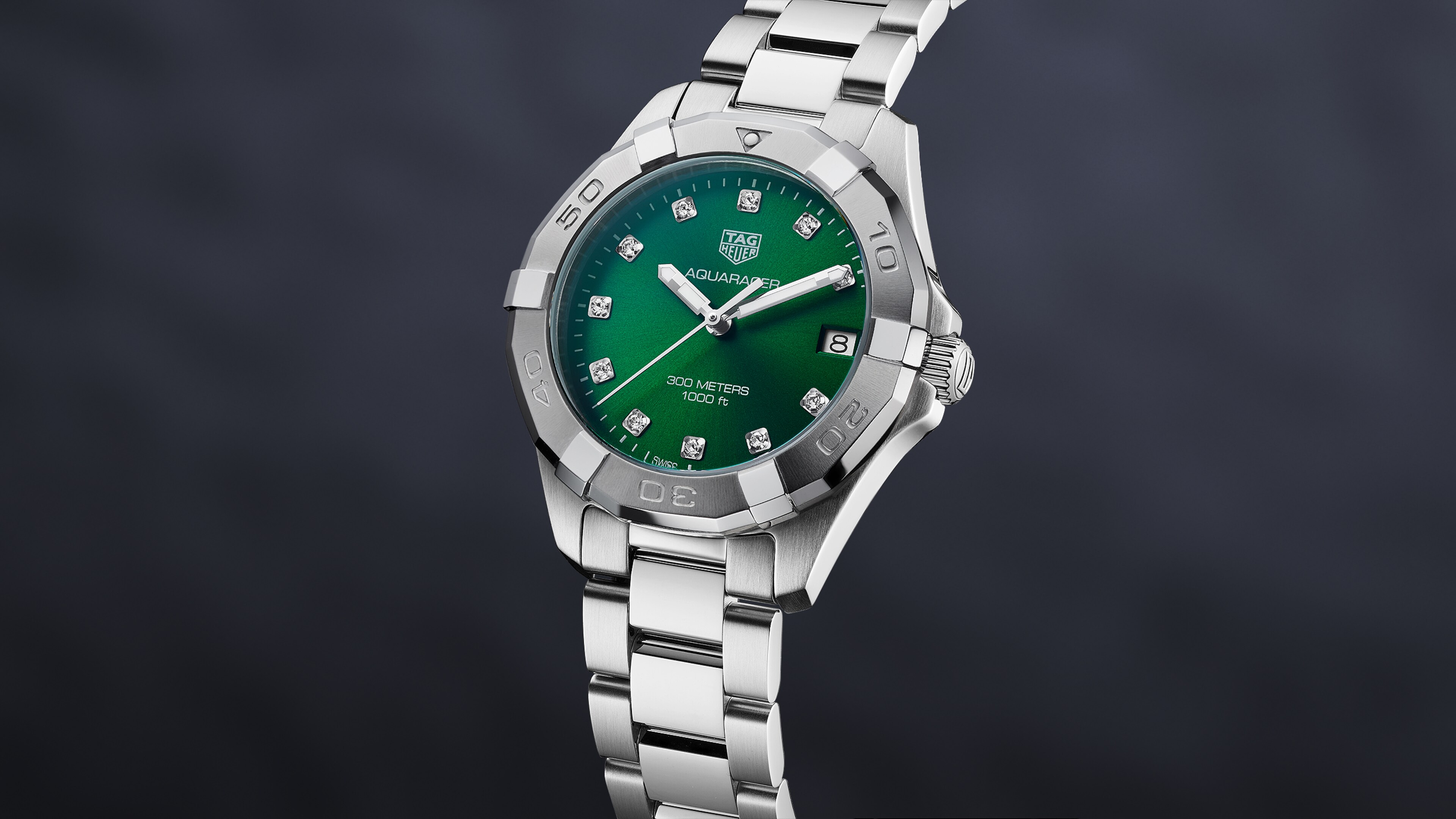 Quartz, 32 mm, Steel WBD1316.BA0740A luxury edition Aquaracer Lady with 11 diamonds (0.11 CT) hour markers on a gorgeous green dial. The 32mm quartz watch is elegant yet loaded with sports watch features.