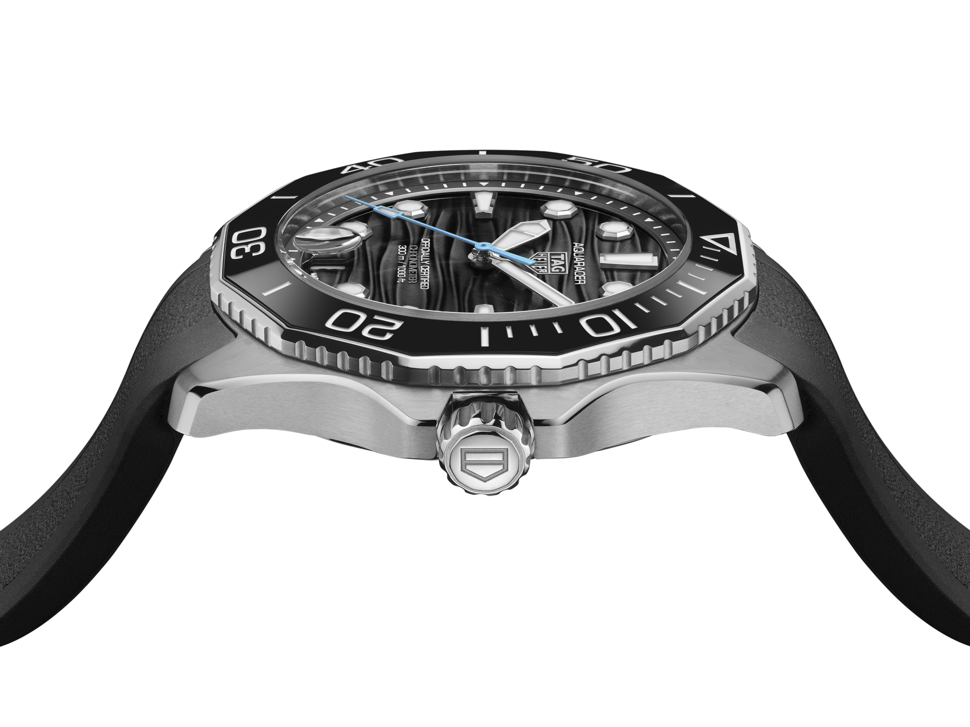 The black wavy pattern dial features luminescent indexes and hands and a light blue central hand evoking the hues of the deep sea. Bold Super-LumiNova® filled hands and octagonal hour markers, offering unrivaled legibility in the darkest. conditions.