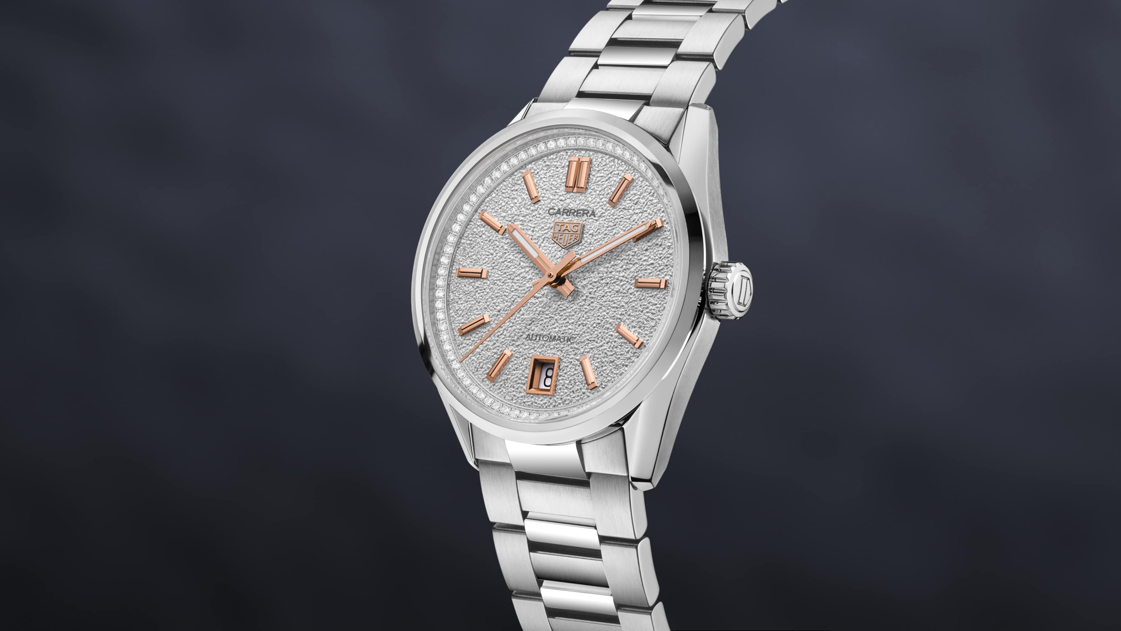 Automatic, 36 mm, Steel WBN231B.BA0001Elegance infuses every element of this luxurious TAG Heuer Carrera, crafted with utmost attention to detail. The subtle alliance of 76 diamonds (0.288 CT), rose gold plated indexes and hands, and silver adds a glamorous edge to this urban watch. An unmissable classic.