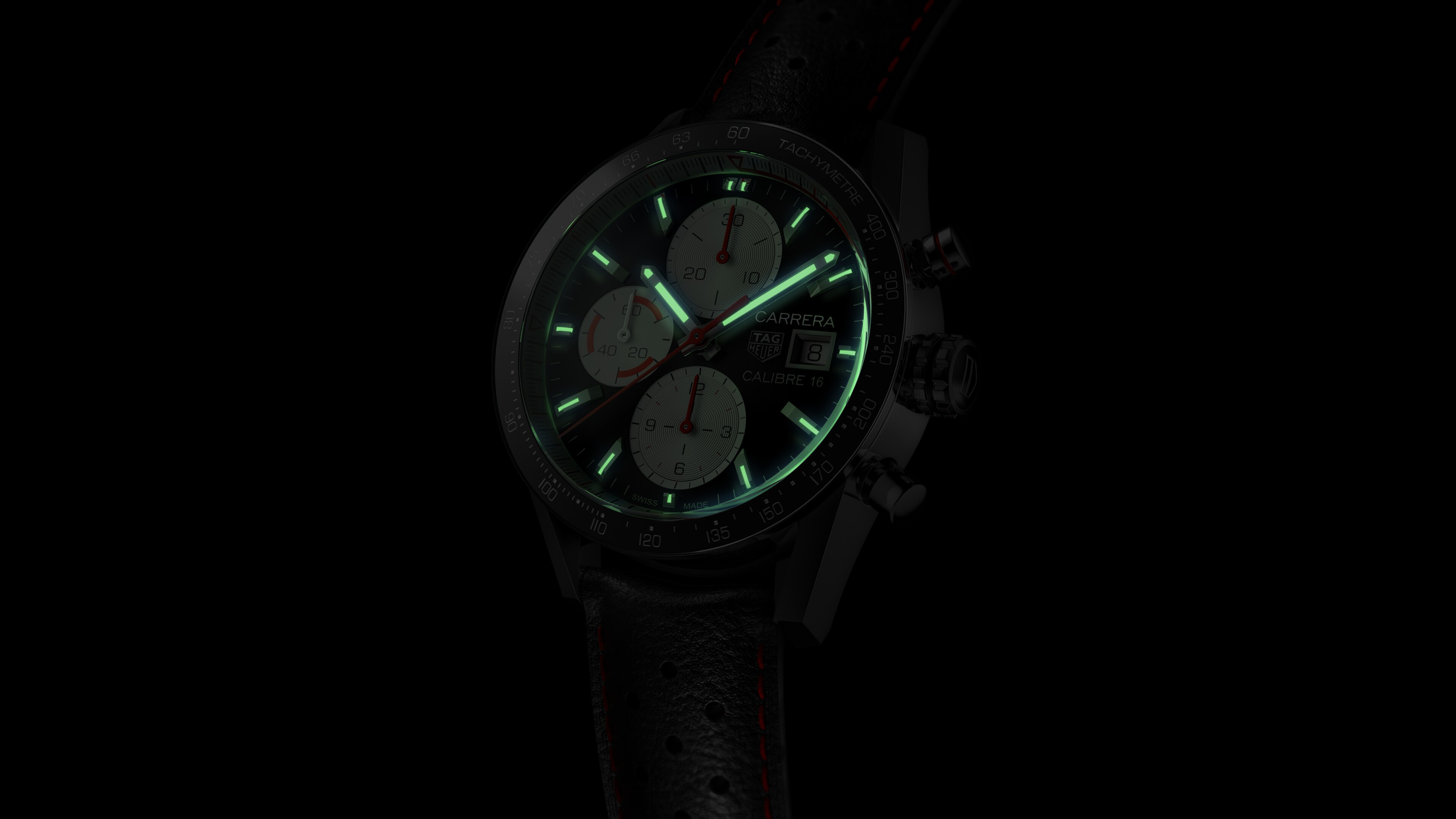 Automatic, 41 mm, Steel CV201AP.FC6429A sporty TAG Heuer Carrera chronograph with black dial, white sub-dials and a black calfskin strap with an eye-catching red lining.