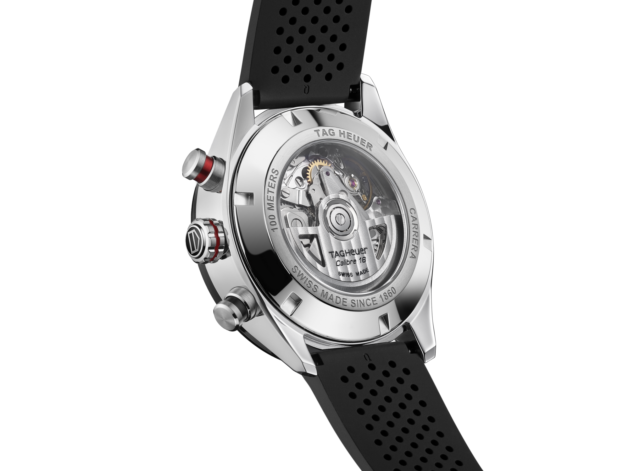 The new perforated rubber strap of this TAG Heuer Carrera adds unstoppable performance and striking luxury to this precision chronograph.