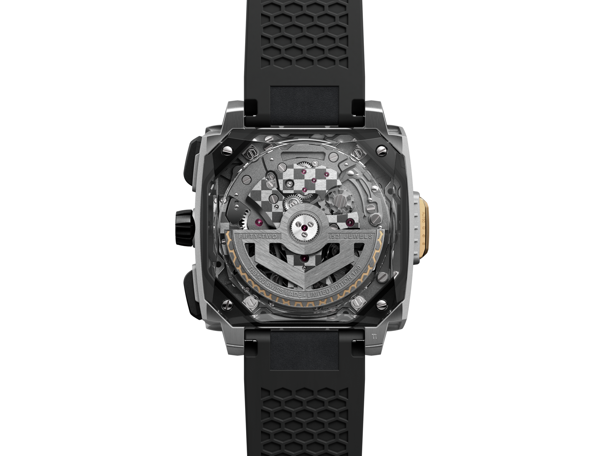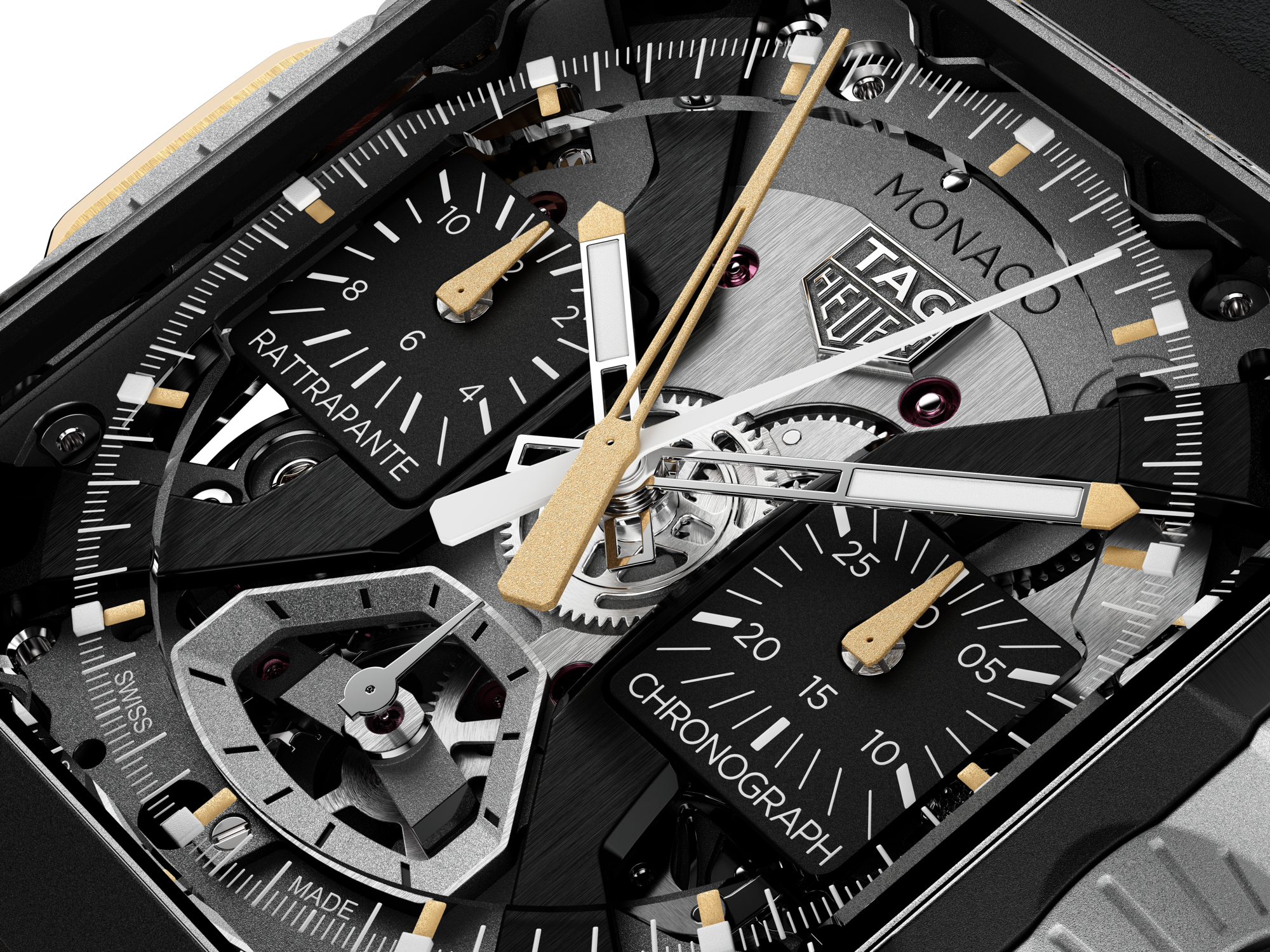 The openworked sapphire dial reveals a commanding view of the split-seconds chronograph Calibre TH81-00—TAG Heuer’s most complex mechanical movement. On the case, solid 18K 2N yellow gold honeycomb structure, precisely cut by laser, echo the form of air intakes, balancing refinement and technicity in a visually striking display.