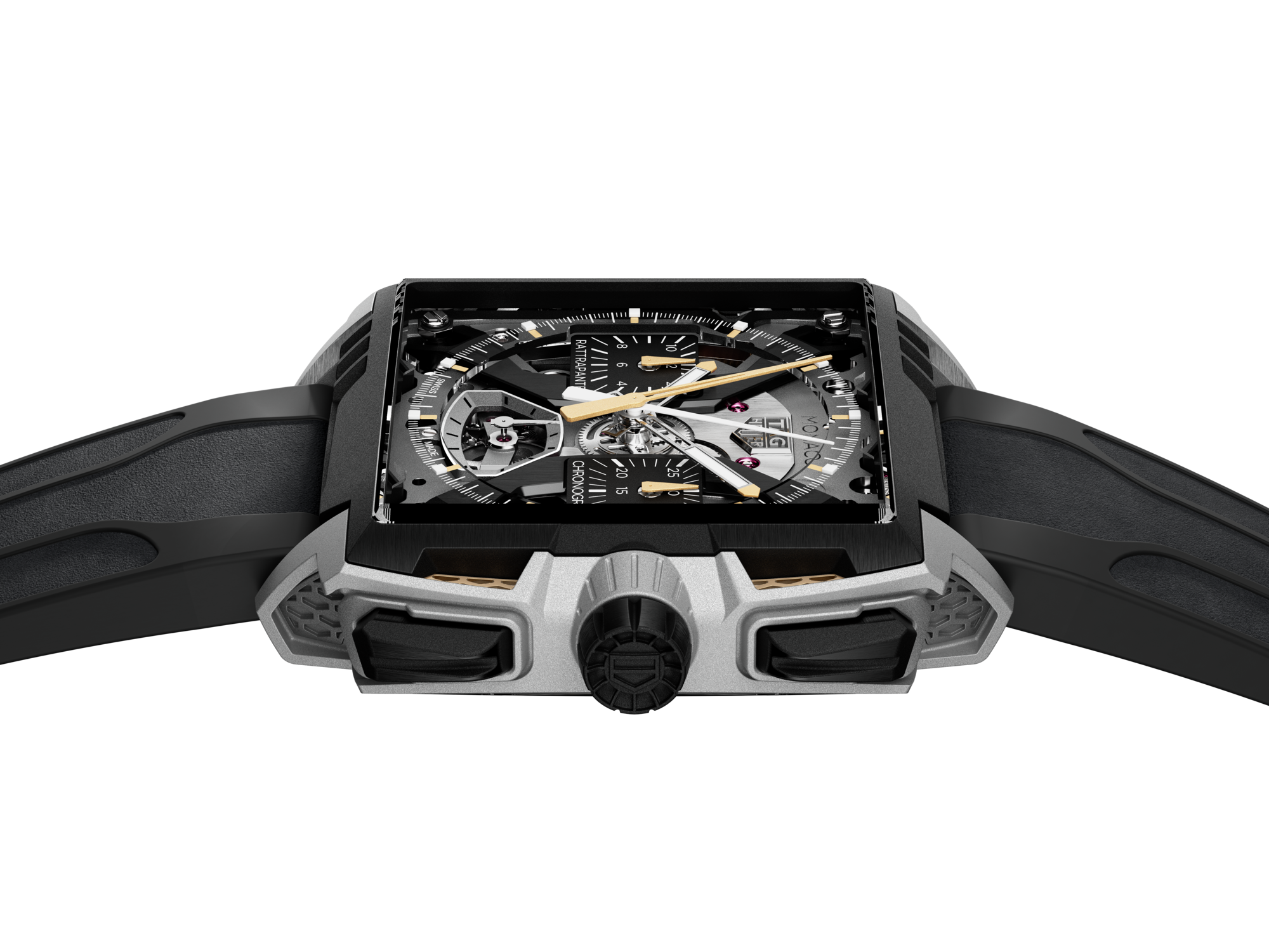 Forged from grade 5 titanium via Selective Laser Melting, a specific type of additive manufacturing, the case’s hollowed structure optimizes airflow while reducing weight. The black DLC-coated titanium bezel and pushers, plus the solid 18K 2N yellow gold split-seconds pusher at 9 o’clock, underscore its disruptive design. Every element, from the golden accents on the dial to the hand-finished caliber, embodies TAG Heuer's avant-garde expression of fine watchmaking.