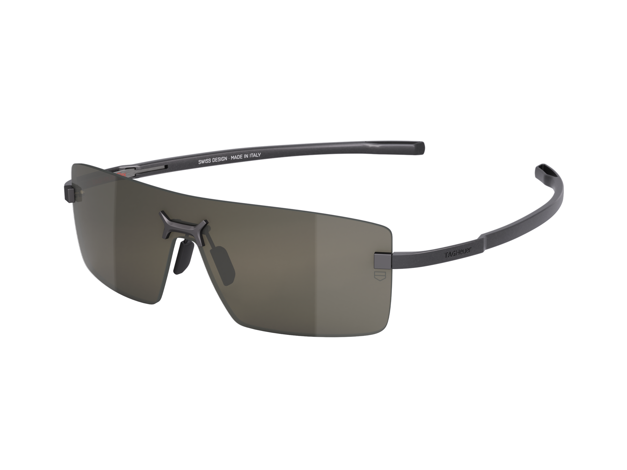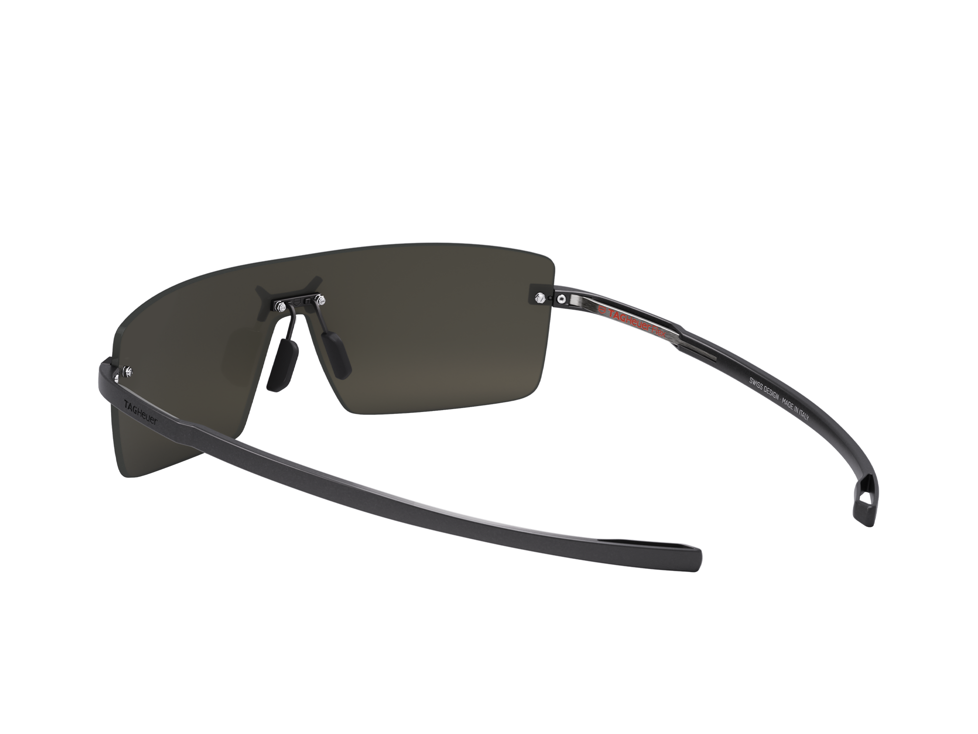 Una fusione di funzionalità e stile con questi occhiali da sole senza montatura TAG Heuer FLEX. Il ponte in titanio nero opaco e le astine in carbonio nero donano un tocco moderno, mentre le lenti scure fumé in nylon biologico offrono una visibilità nitida, per un alleato urbano, elegante e versatile.