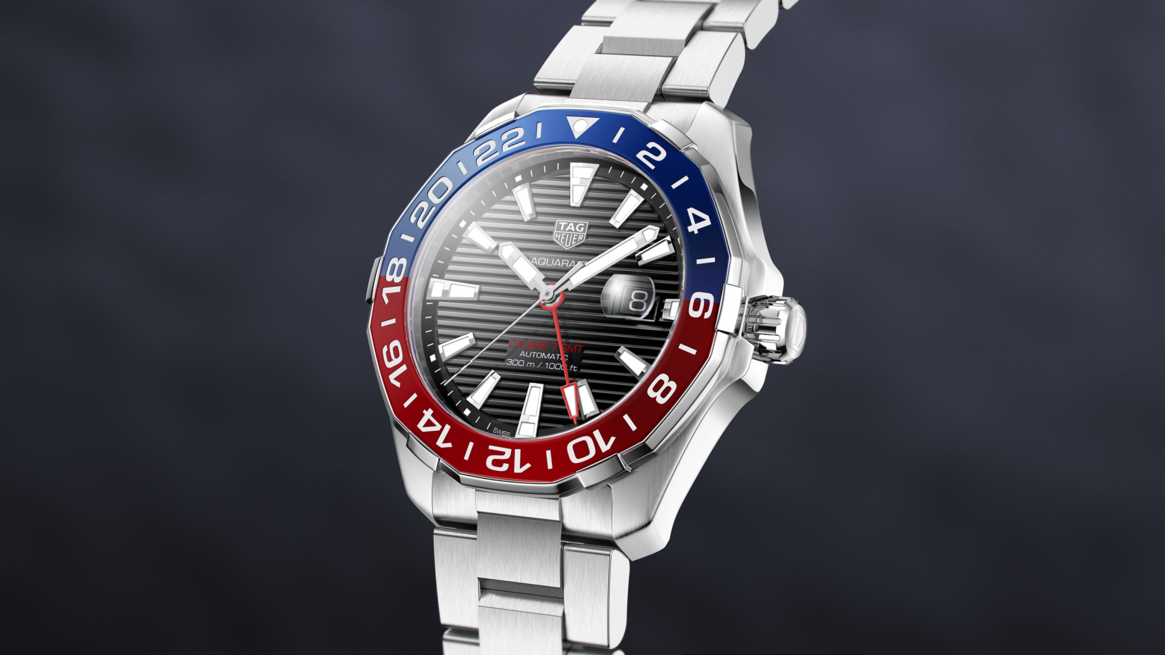 Automatico, 43 mm, Acciaio WAY201F.BA0927Un Aquaracer animato dal Calibre 7 GMT, con ampia cassa da 43 mm e lunetta bicolore con funzione GMT per ulteriori fusi orari. Il caratteristico effetto striato orizzontale del quadrante e gli speciali indicatori luminescenti sulle lancette e sugli indici consentono di leggere facilmente l'ora in condizioni di scarsa luminosità o sott'acqua.