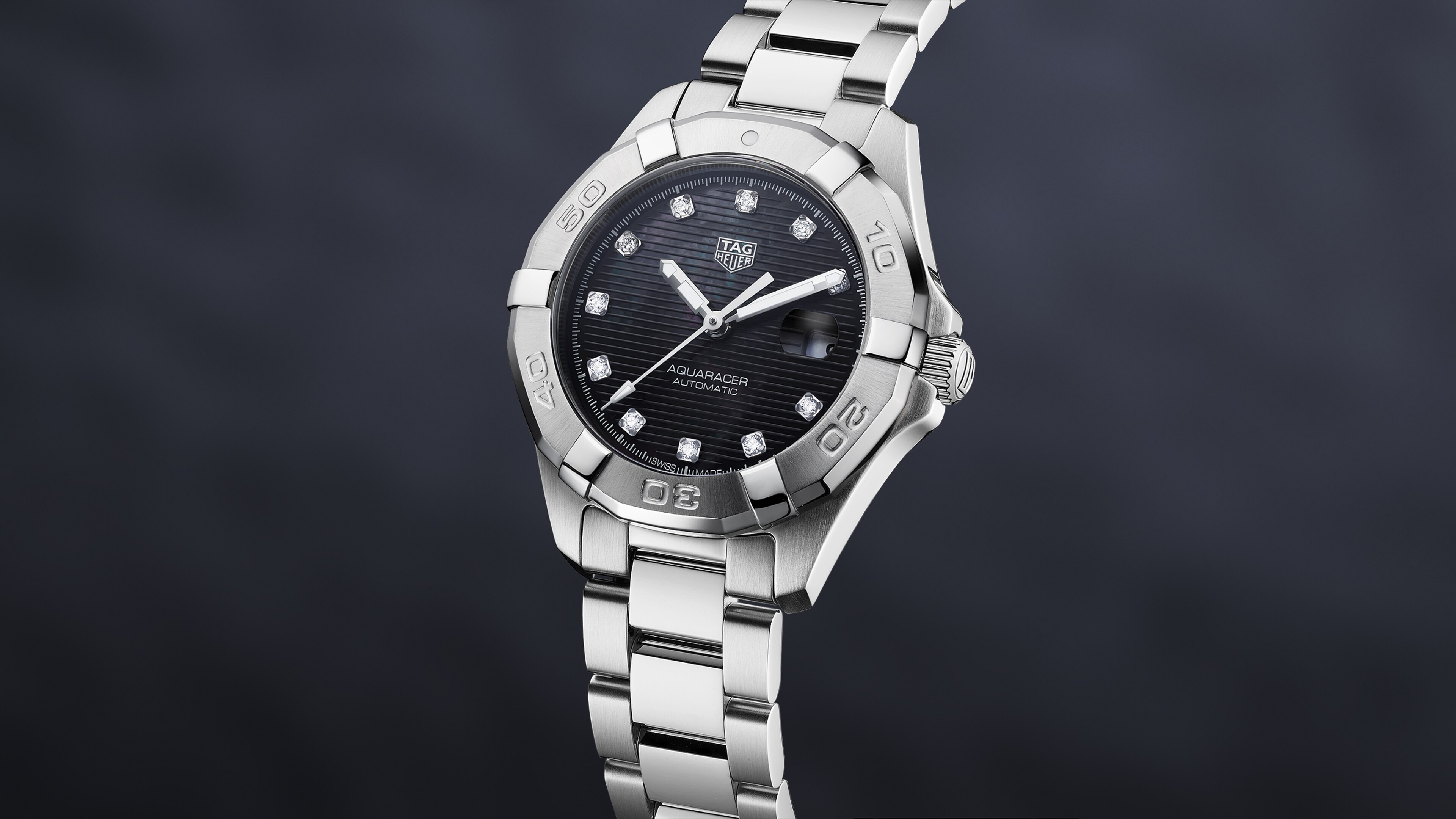 Cette montre Aquaracer Lady, avec cadran en nacre noire et diamants, est élégante tout en offrant les attributs essentiels d'une montre de sport. Cette pièce est dotée d'un mouvement automatique Calibre 9 et étanche à 300 mètres.
