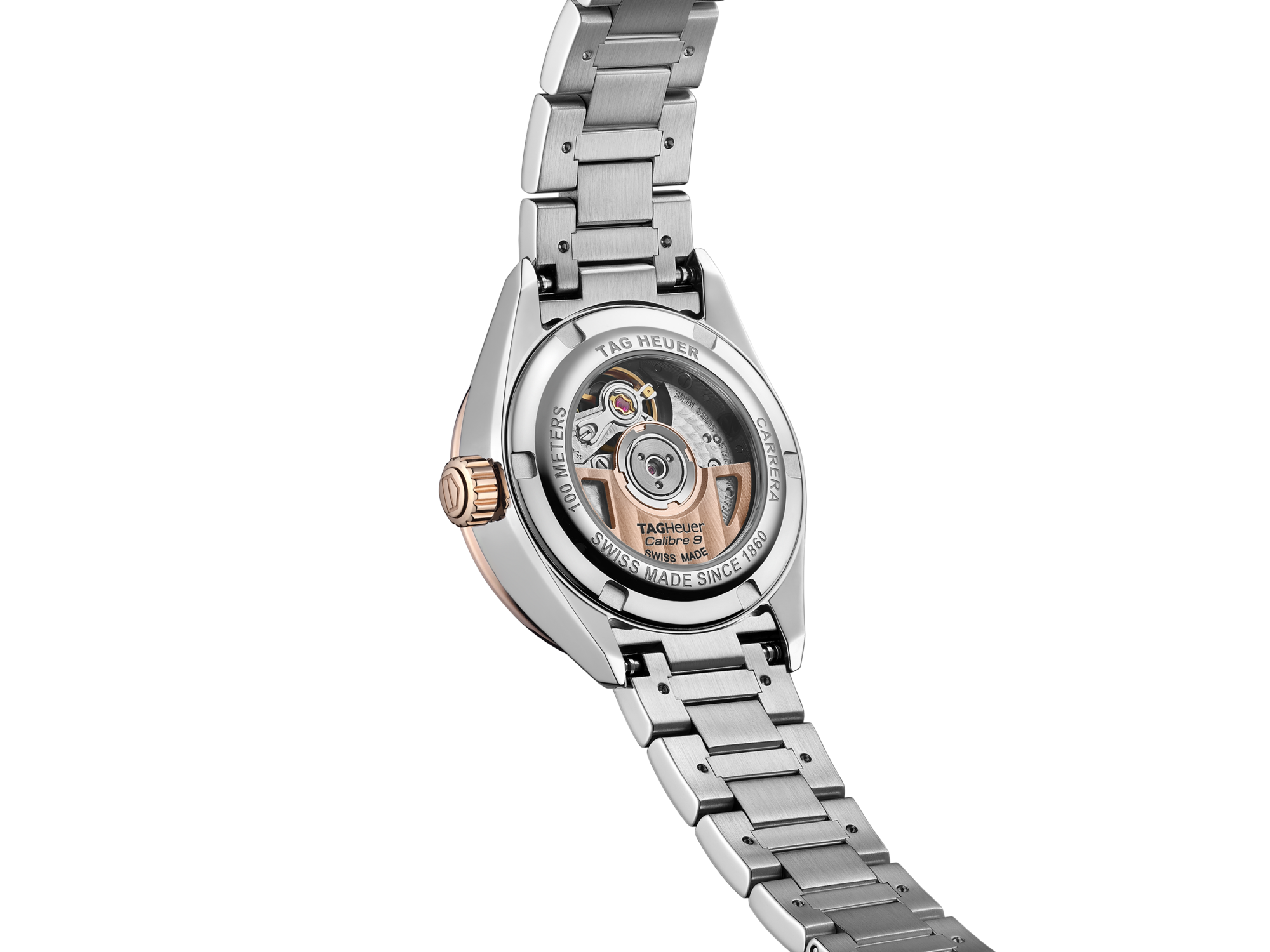 Cette TAG Heuer Carrera de 29 mm avec un boîtier en acier et or rose est sertie de diamants sur la lunette, le boîtier et le bracelet. Une élégance ambitieuse dans toute sa splendeur.